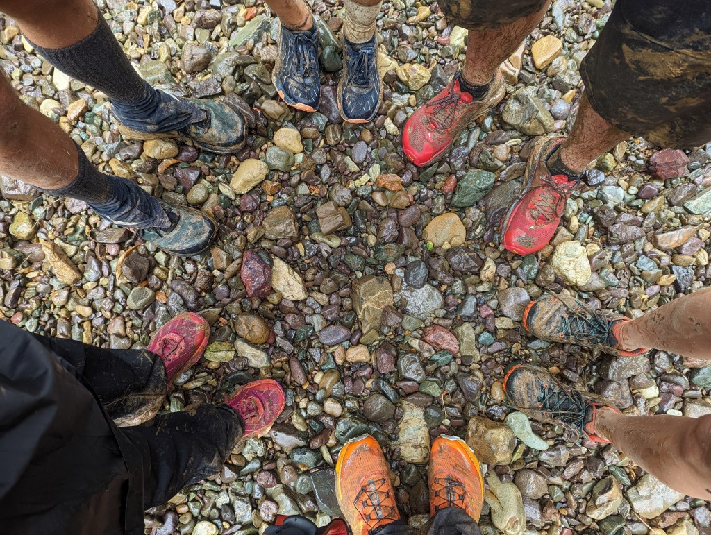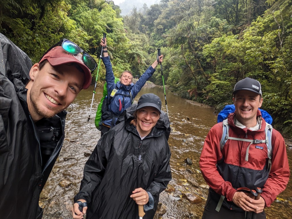 Une heure plus tard, vers 12:00, une petit pause s’impose au bord de la rivière. La pluie s’est enfin arrêtée alors on retire nos ponchos et c’est là qu’on découvre à quel point on pue la transpiration là dessous haha! C’est vraiment pas respirant mais au moins ça a fait son taf. D’autant plus qu’on a pas eu l’occasion de vraiment se nettoyer même juste de se rincer au campement d’hier soir alors il y a un gros cumul d’odeurs. Miam! Je rigole en disant que j’ai enfin trouvé un moyen de faire puer la laine mérinos ^^. On a bien besoin et envie d’une douche ce soir.