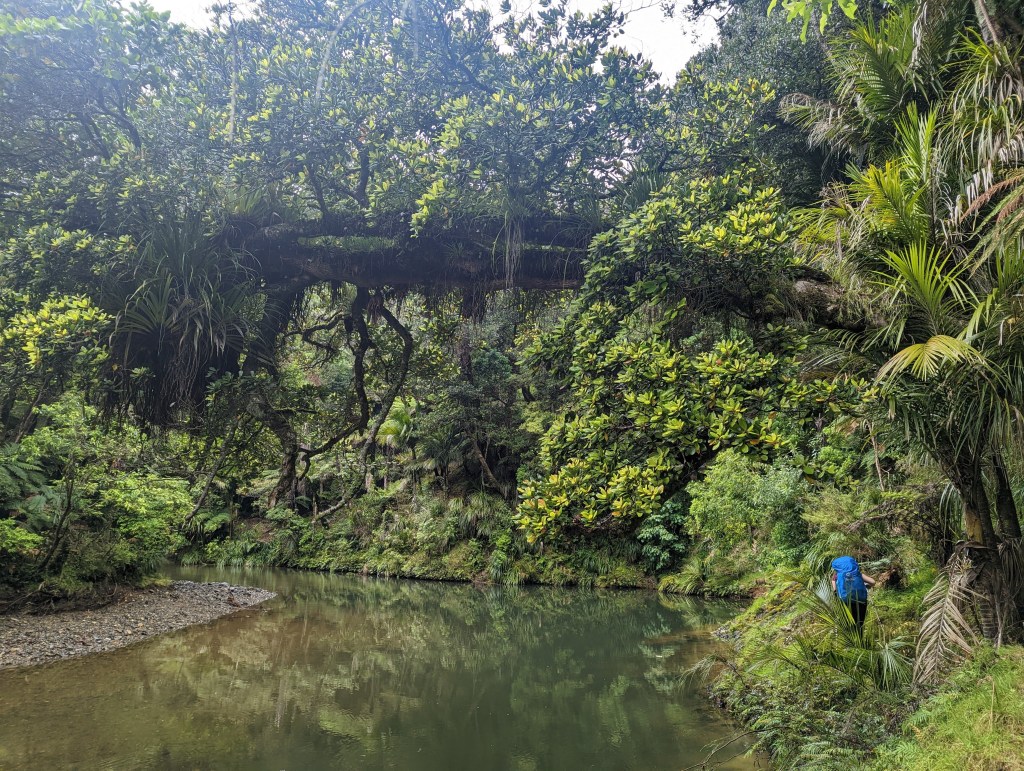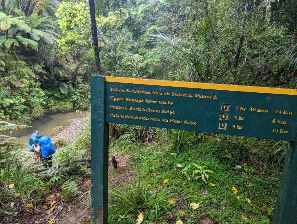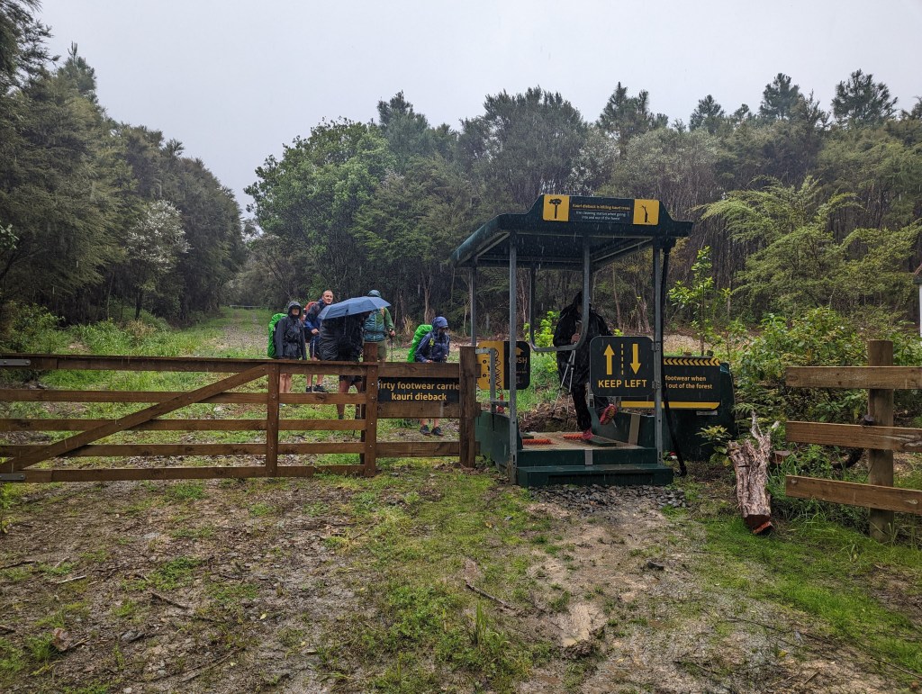 On commence avec 5km de route de gravier facile jusqu’à l’entrée de la forêt où il faut se nettoyer et se désinfecter les chaussures pour protéger les Kauri d’une terrible maladie, le Kauri Dieback, qui les tues lentement. C’est une sorte de champignon blanc dont les spores sont transportés par les chaussures. D’ailleurs plusieurs forêts sont déjà fermées au public (dont une qui était traversée par le TA il y a quelques années) pour protéger ces arbres.