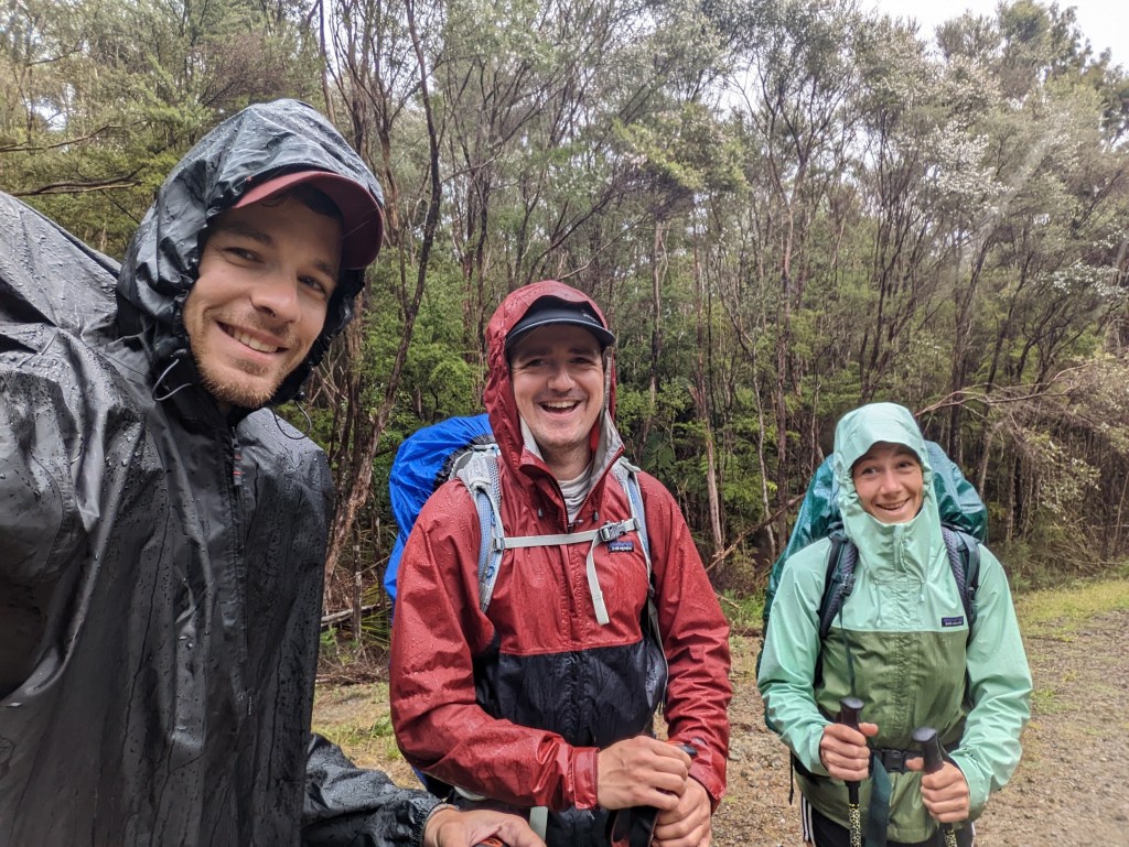 Réveil à 6:20 et départ à 7:35 du camp sous la pluie. On a jamais été prêt aussi tôt et si rapidement ! La température fraîche mais surtout la pluie sont de très bons motivateurs pour plier la tente et déjeuner en vitesse. C’est d’ailleurs notre premier rangement de la tente sous la pluie et sûrement pas le dernier… C’est pas très fun et on est forcé de la rouler encore bien imbibée d’eau. Ça fait du poid en plus à porter :/… La pluie devrait se calmer dans l’aprèm. Tout du moins c’est ce qu’on espère… En attendant c’est l’averse. Du coup on sort les ponchos. Très efficaces ces trucs-là ! Au moins les sac resteront secs.