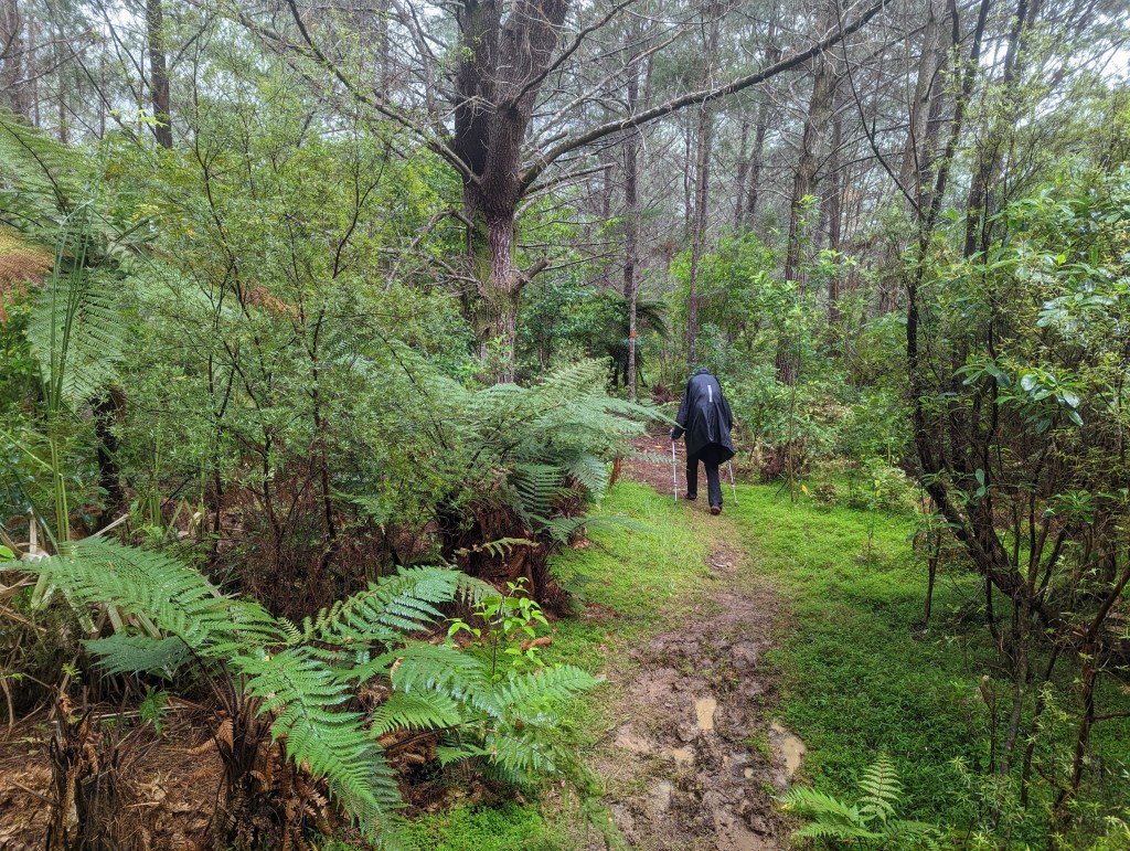 Malheureusement, vers 11:00 nous atteignons la fin de la partie rivière de la marche et nous devons retourner dans la forêt et ses sentiers boueux. La pluie a beaucoup diminué mais nous gardons les ponchos en attendant que ça s’arrête pour de bon. La marche dans la boue est éprouvante et notre rythme est très lent. (Plus tard on calculera qu’on n’a même pas atteint les 2km/h sur ce tronçon)