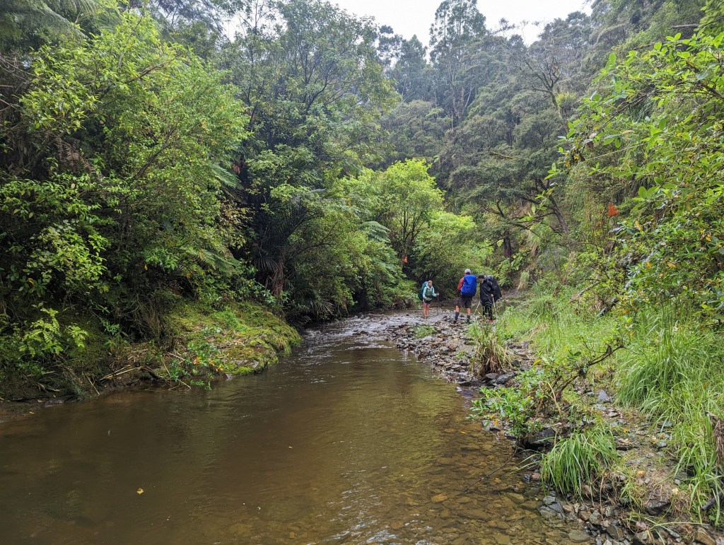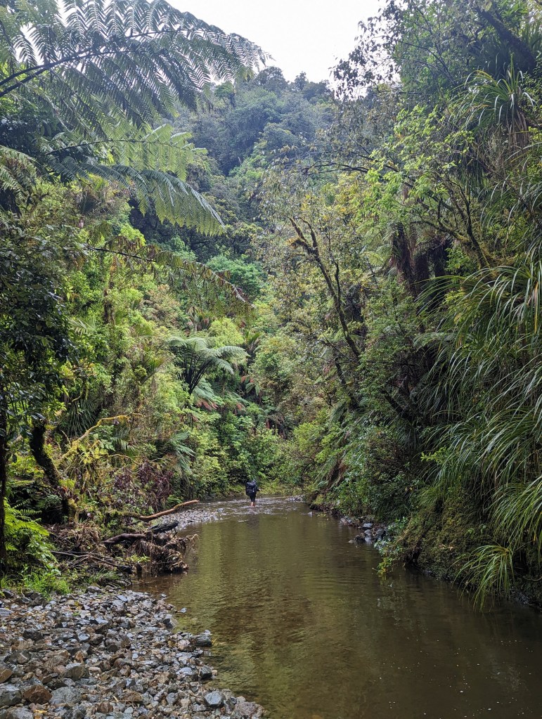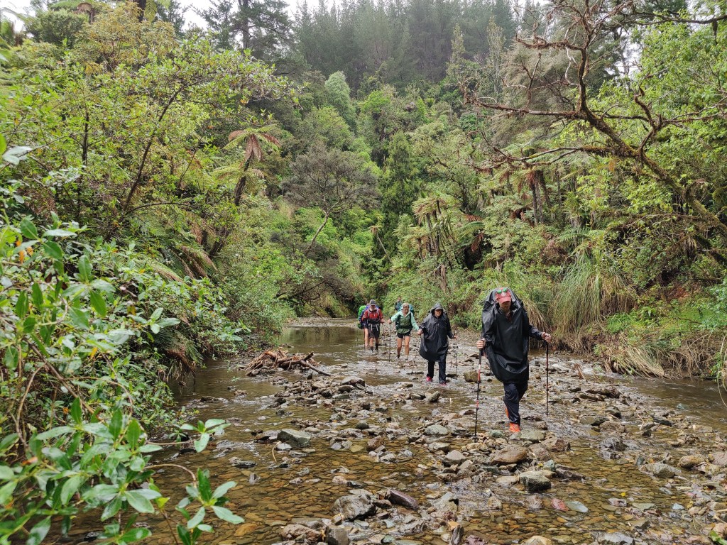 Nous continuons notre avancée dans la forêt alors que la route se transforme progressivement en sentier forestier extrêmement boueux. D’autant plus que la pluie continue de tomber ce qui n’arrange pas l’état du chemin. Vers 9:15 nous atteignons le fond de la vallée et par la même occasion la rivière qui y coule : la Mangapukahukahu (répétez ça plusieurs fois très vite :p). Nous marchons dans cette rivière sur quelques kilomètres. Le lieu est absolument superbe. On est vraiment dans une forêt vierge complètement entourés de fougères arborescentes et autres espèces locales. Toute l’équipe est en extase et adore l’expérience.