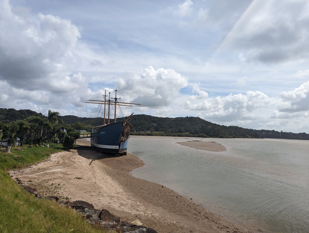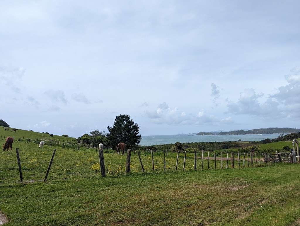 13:30 pause lunch au sommet d’une petite colline avec une vue superbe sur Paihia et la Bay of Islands. Le soleil tape fort mais ça fait le plus grand bien ! On en profite pour traîner un moment dans l’herbe.