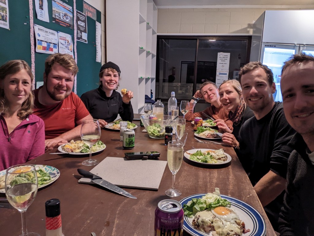 19:00 on prépare des röstis ce soir ! Une idée de Marie pour nos amis de randonnée. Avec petit verre de blanc (néo-zélandais) s’il vous plait ! On prépare le plat de A à Z. Heureusement il y a même 3 râpes pour les patates ^^. On fait 2 poêle: une végétarienne et une avec du bacon. On saupoudre aussi de fromage râpé pour pas faire dans la demi mesure et pour finir on pose dans chaque assiette une œuf au plat. C’est un grand succès même si les patates utilisées ne sont pas idéales ^^