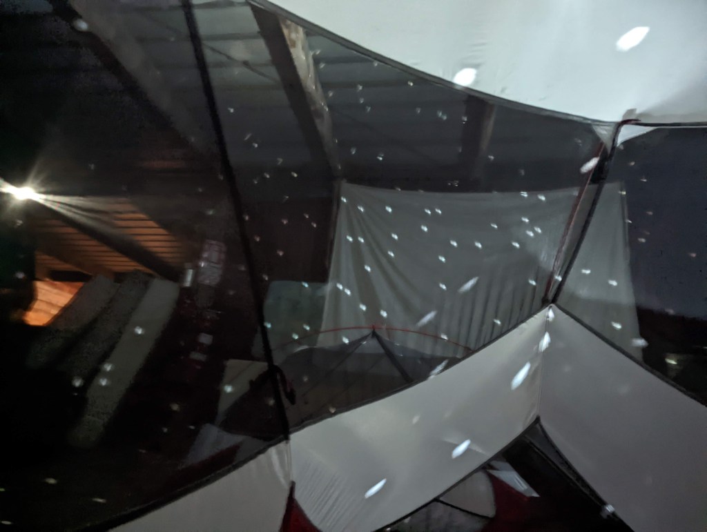After we go to bed, he attacks and tears off for 20 minutes a cushion right next to the tents of some and the duvets of others. Everyone’s a little bit stressed because we fear that he’ll go after one of those things afterwards. But, luckily, more fear than harm and the puppy goes away for the night.