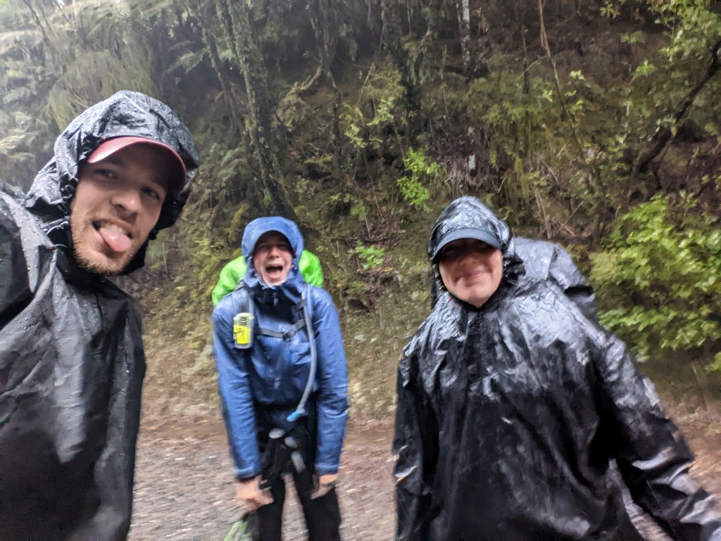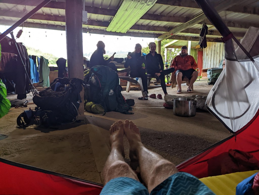 Under our shelter joins us a Scottish guy, Aaron, who also does the TA and whom we had quickly met in Kaitaia. He also travels in a kilt! It’s so cool. He takes a flask of whiskey out of his satchel and shares it with us. Happy faces all around 🙂