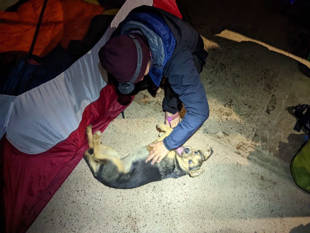 Après qu’on se soit couché, il s’attaque et déchire pendant 20 min un coussin juste à côté des tentes des uns et des duvets des autres. Tout le monde est un peu tendu, car on craint qu’il ne s’attaque à l’une de ces choses après. Mais, heureusement, plus de peur que de mal et le chiot s’en va pour la nuit.