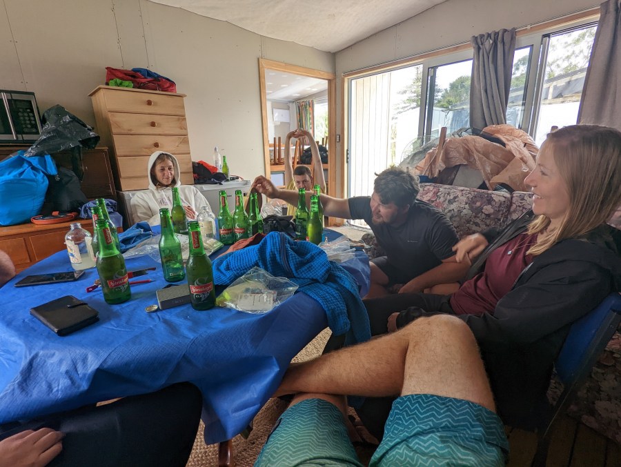 On arrive déjà vers 13:15 au holiday park! Neele et Sean nous ont dégoté une cabine pour pas cher. On dort un peu au milieu de mobilier en désordre car la cabine est en partielle rénovation (d’où le prix bas). Mais au moins on peut passer la nuit à l’abri et au sec car il est annoncé un orage cette nuit et demain encore plus violent que celui d’il y a deux jours.