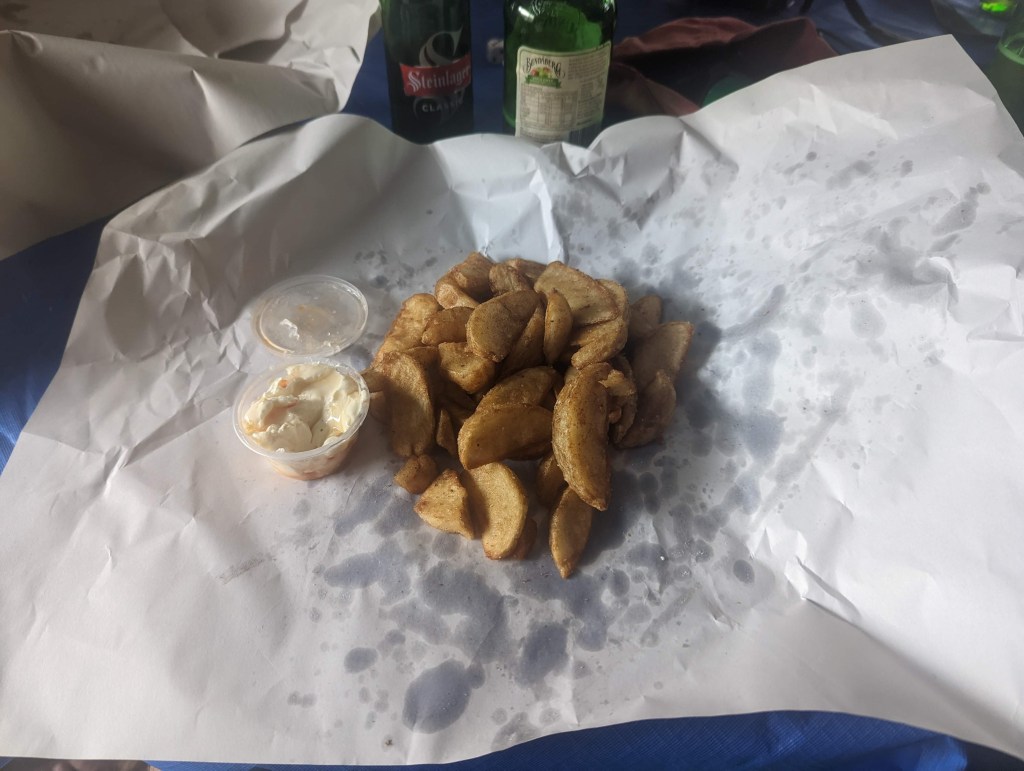 In the meantime, we’re taking advantage of the mild weather to start washing clothes and take a good hot shower before going to get some food at the little shop at the entrance to the park. There are the usual fish’n’chips and other deliciously not very healthy but not very expensive stuff.