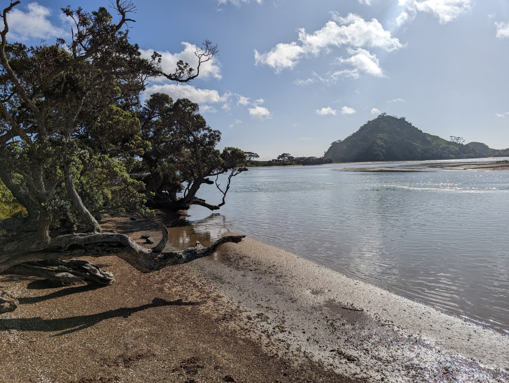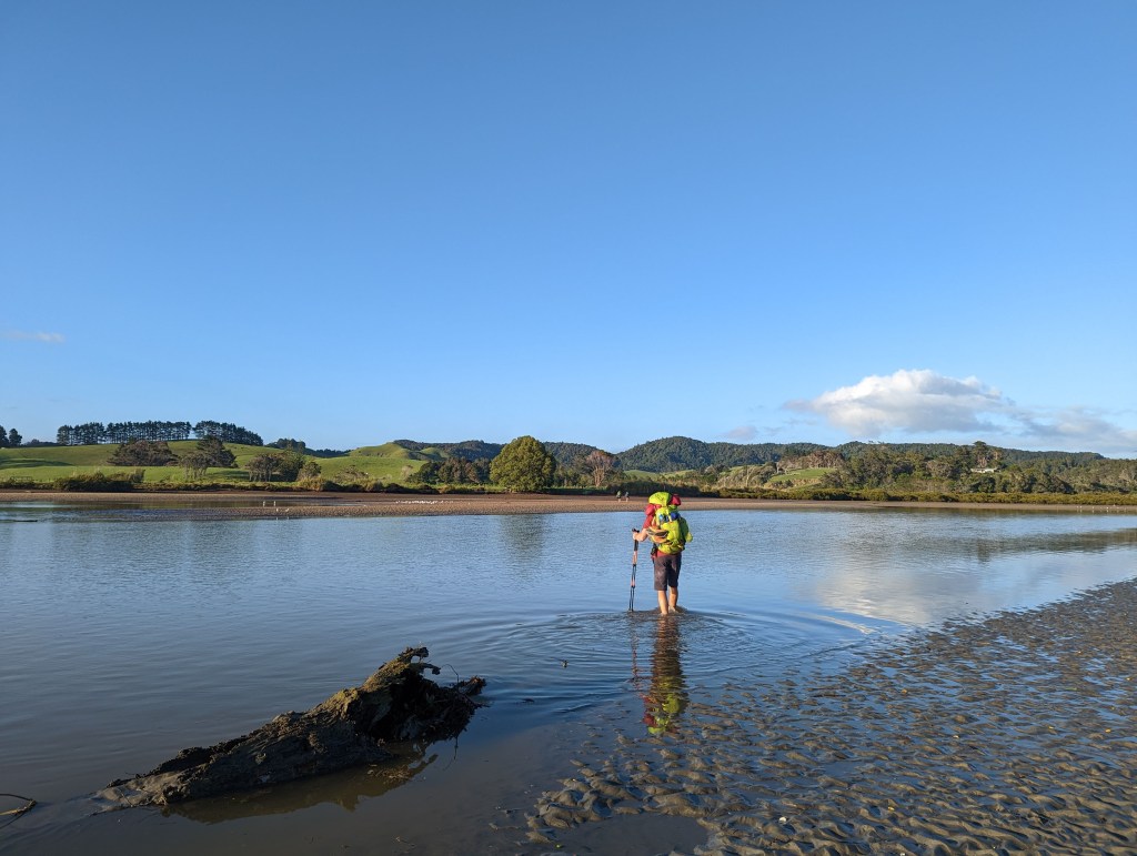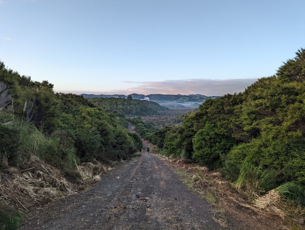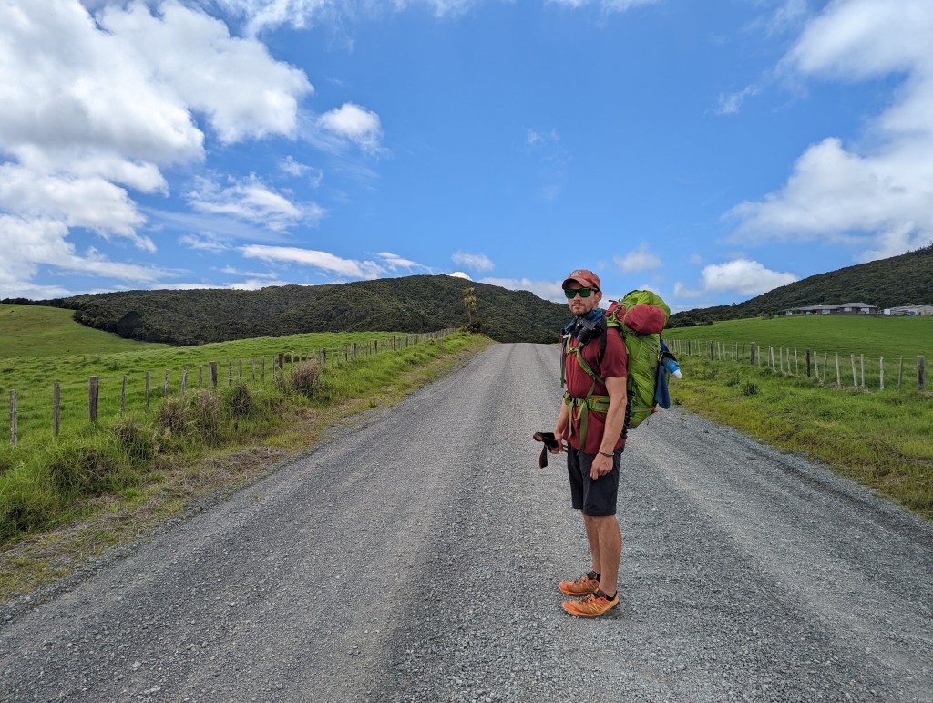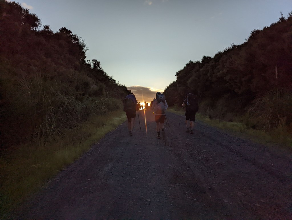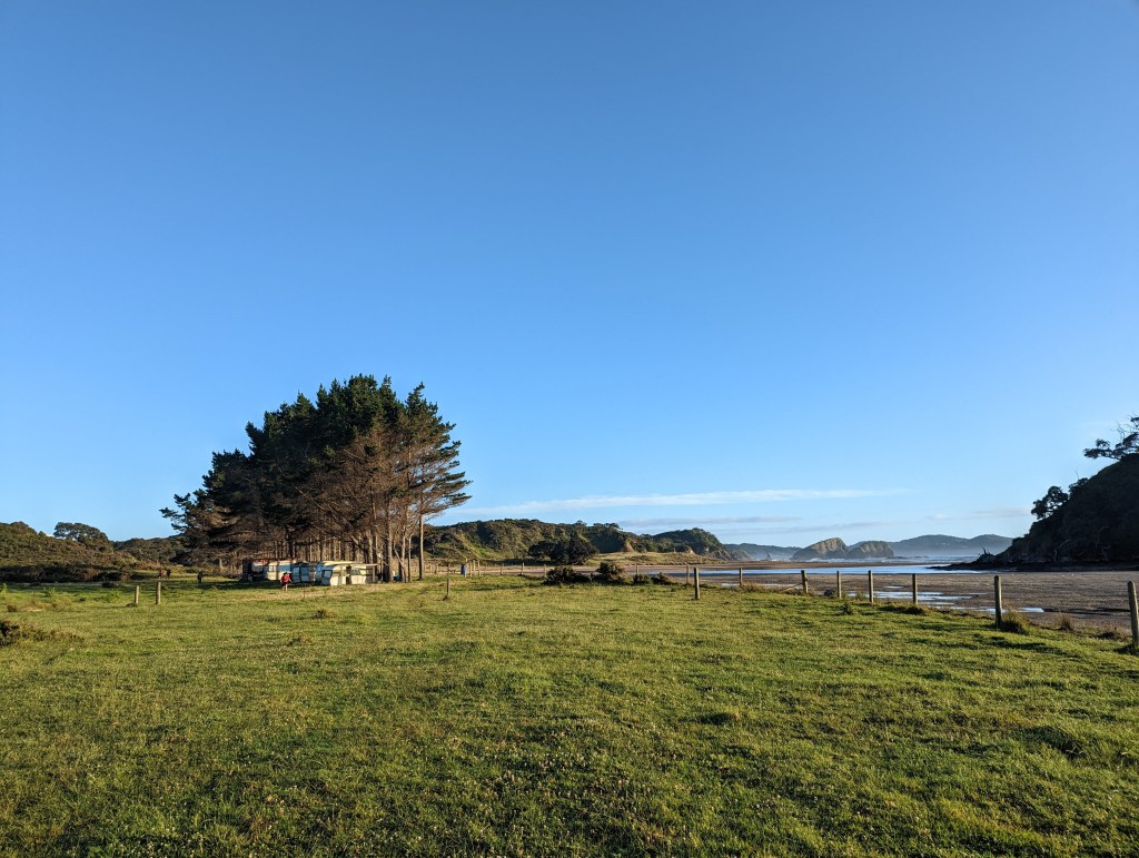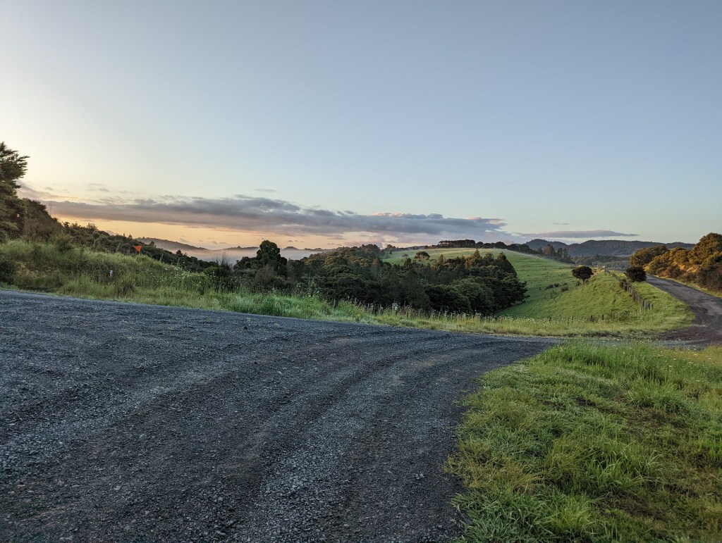 6:05 départ du camp ! Gaaah 5 minutes de retard au plan prévu haha. On commence avec le soleil levant à traverser cette presqu’île qui est une terre Maori et privée mais où les habitants laissent gracieusement passer les hikers. Nous passons dans le jardin d’une dame appelée Violette vers 7:00 du matin. On est le plus discret possible. *N.d.l.r. : plus tard nous apprendrons que cette dame est malheureusement décédée la semaine suivant notre passage 😦 et par conséquent ce bout de trajet a été fermé le temps du deuil*