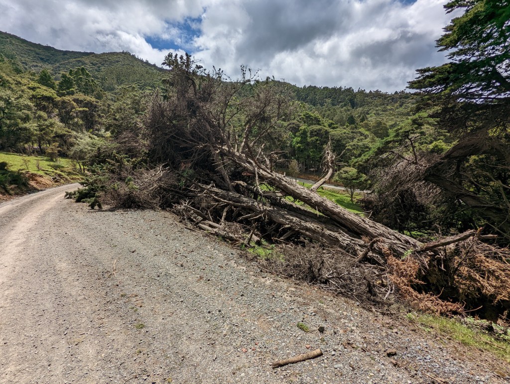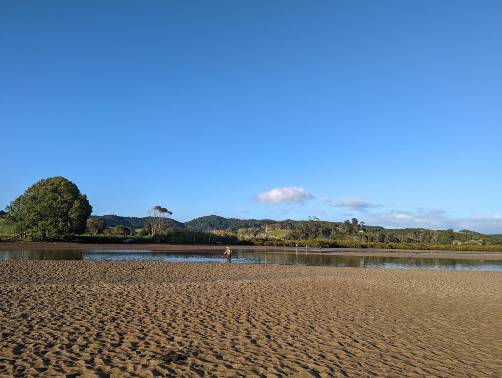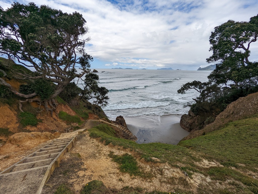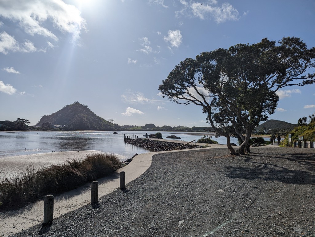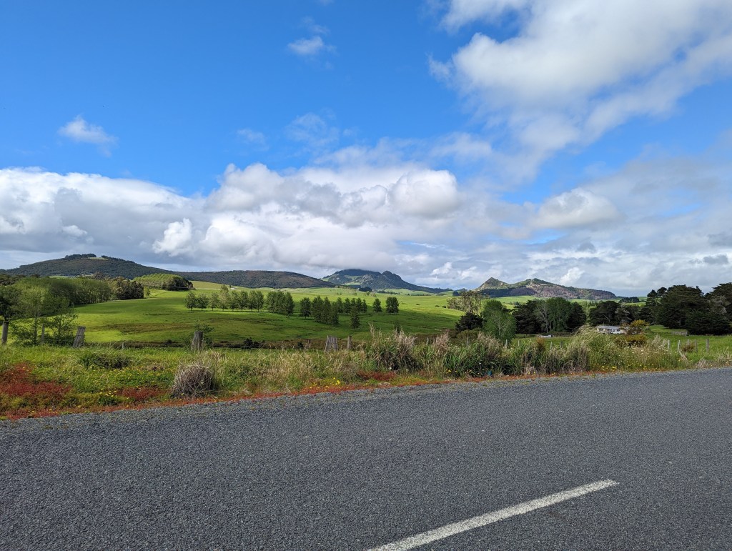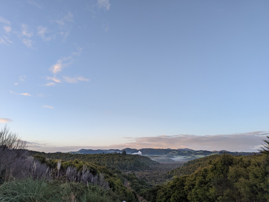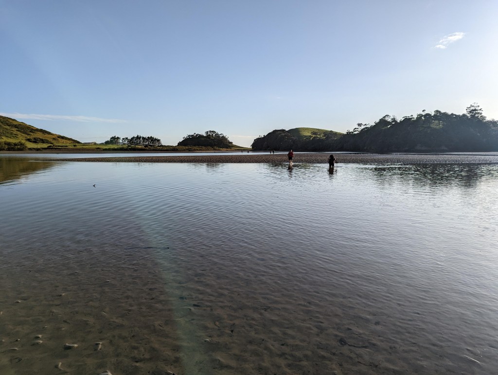 6:05 départ du camp ! Gaaah 5 minutes de retard au plan prévu haha. On commence avec le soleil levant à traverser cette presqu’île qui est une terre Maori et privée mais où les habitants laissent gracieusement passer les hikers. Nous passons dans le jardin d’une dame appelée Violette vers 7:00 du matin. On est le plus discret possible. *N.d.l.r. : plus tard nous apprendrons que cette dame est malheureusement décédée la semaine suivant notre passage 😦 et par conséquent ce bout de trajet a été fermé le temps du deuil*
