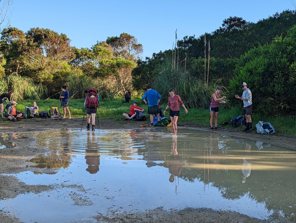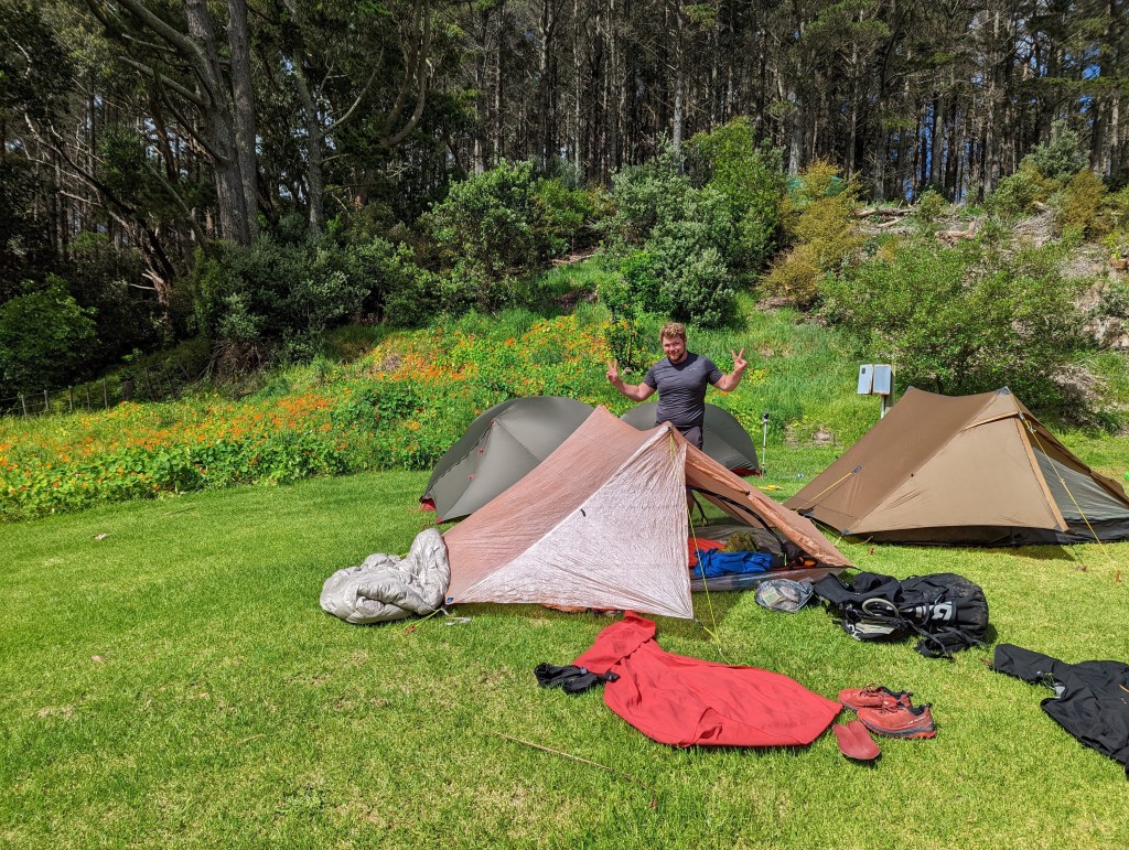 6.5km plus tard, vers 15:20 on arrive enfin au camp pour compléter nos 31km du jour. Et grand luxe, il y a même une petite douche chaude mise à disposition. Mais avant d’en profiter pleinement, Neele, Sean et nous allons piquer une tête dans l’océan. C’est notre première fois de ce côté là de du Pacifique (et dans le sud en plus) !