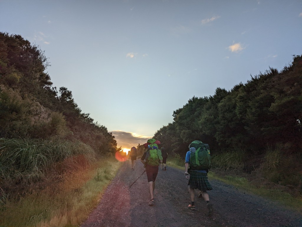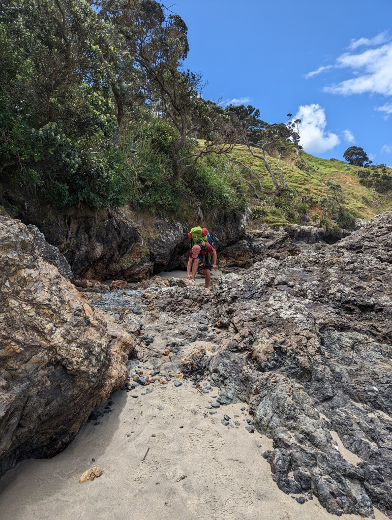 6:05 departure from camp! Gaaah 5 minutes late from what was planned haha. We start as the sun rises to cross this peninsula which is Maori land and private land but where the inhabitants graciously let hikers pass. We pass in the garden of the old lady called Violette around 7:00 in the morning. We are as discreet as possible. *Editor’s note : later we will learn that this lady unfortunately died the week following our visit 😦 and therefore this part of the journey was closed for the time of mourning *
