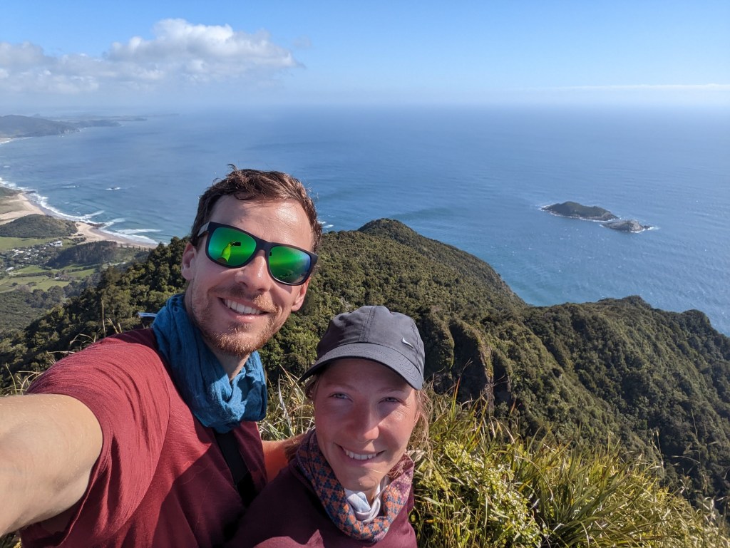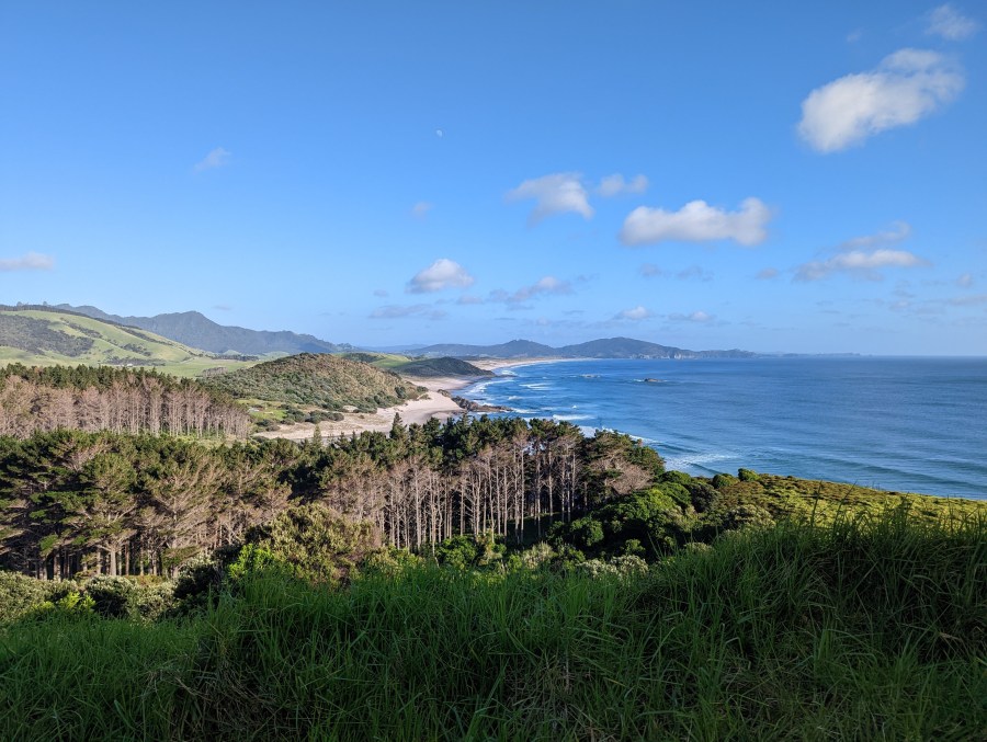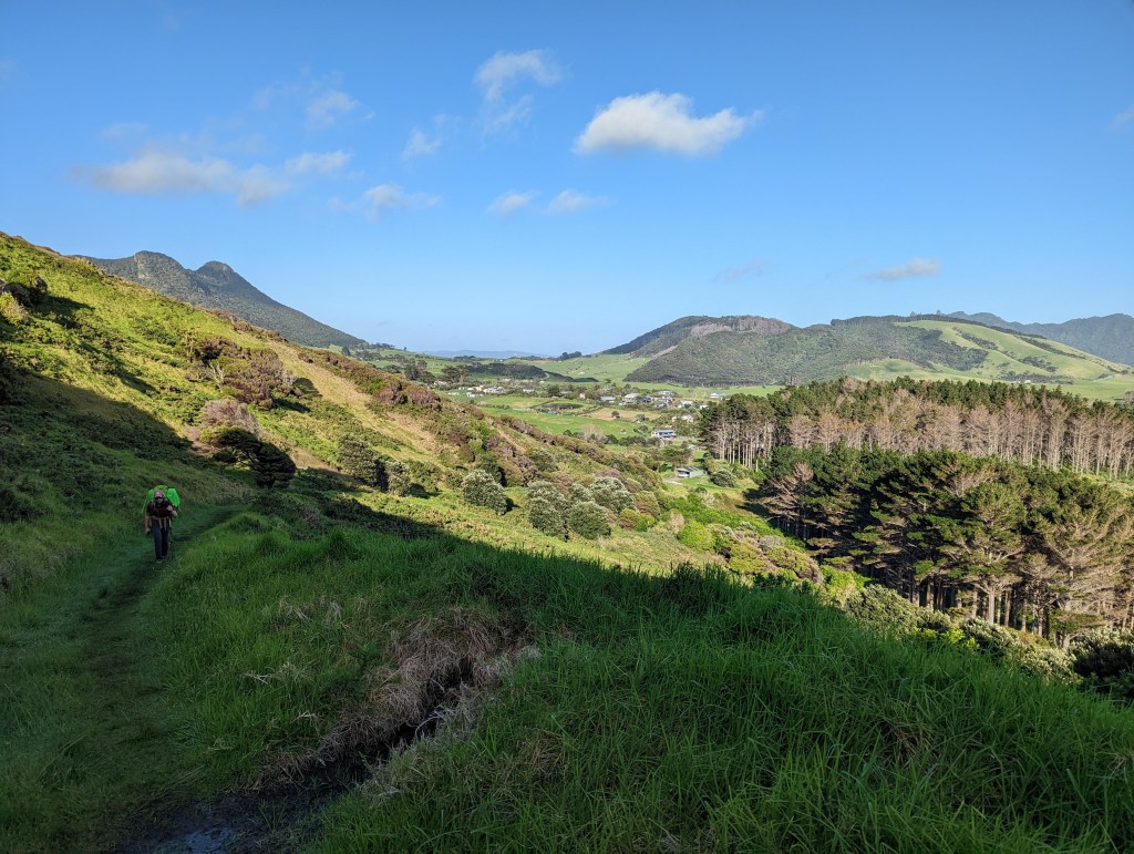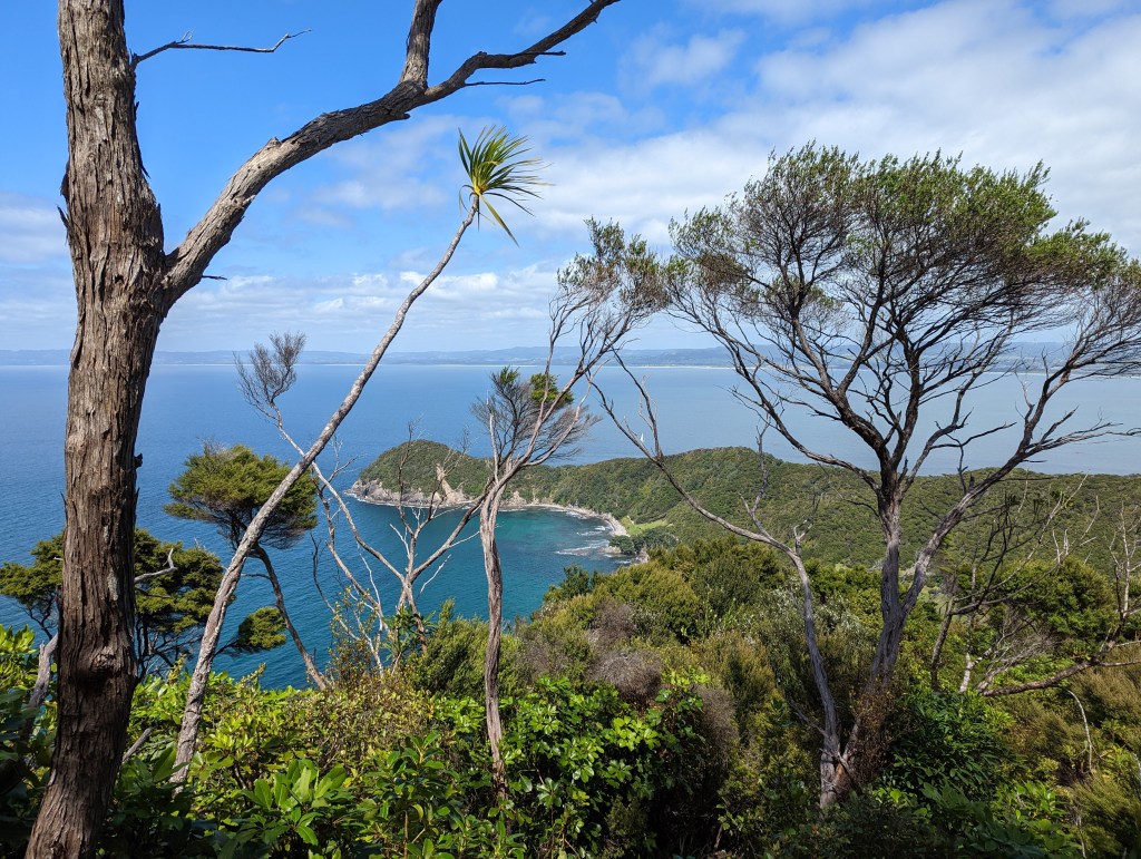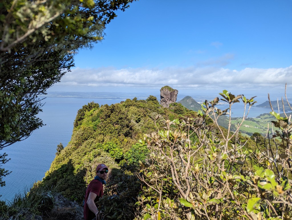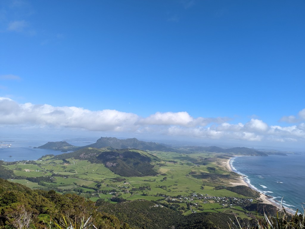 On serre les dents et en une heure on arrive en haut à un point de vue absolument hallucinant avec un panorama à 360° sur l’Océan, la côte et tout autour ! On y reste une 30aine de minutes pour admirer le paysage et prendre quelques photos avant de continuer à suivre le Te Whara Track qui longe toute l’arrête de la petite formation montagneuse.