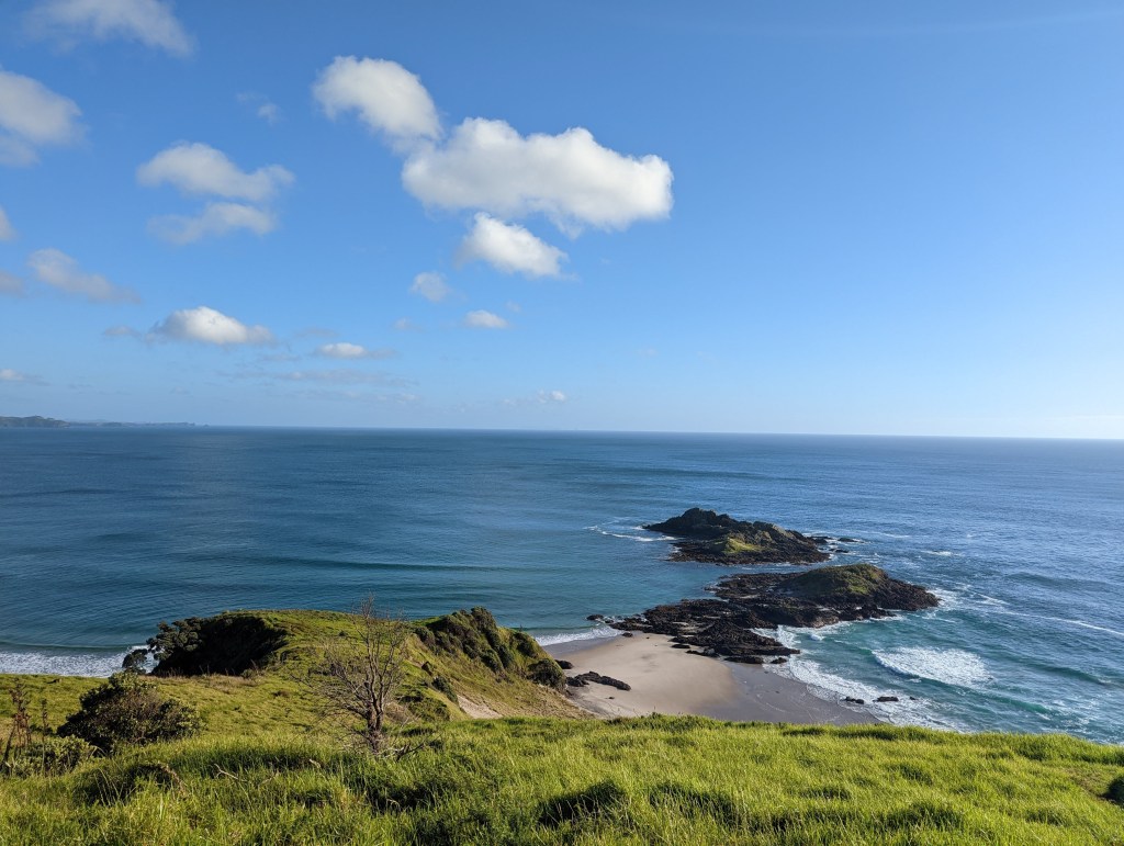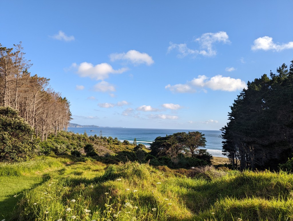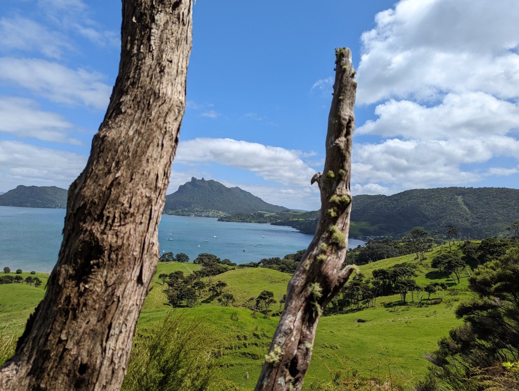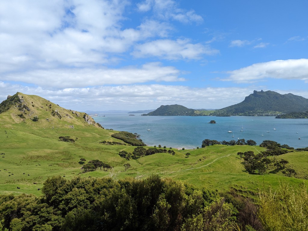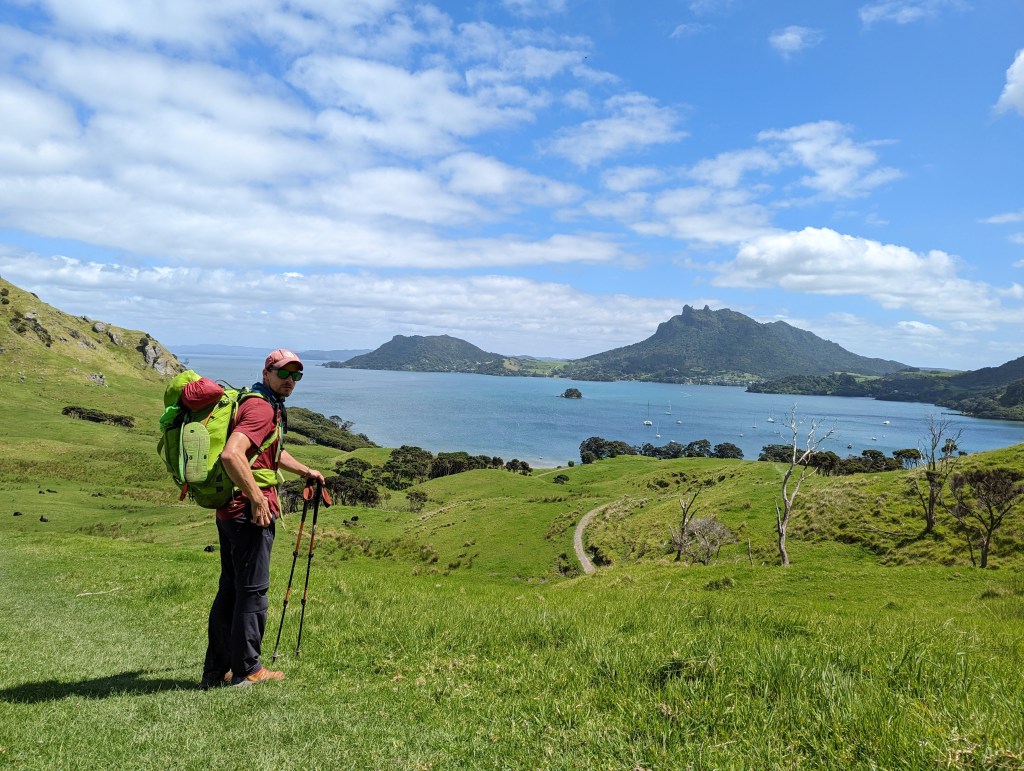 On serre les dents et en une heure on arrive en haut à un point de vue absolument hallucinant avec un panorama à 360° sur l’Océan, la côte et tout autour ! On y reste une 30aine de minutes pour admirer le paysage et prendre quelques photos avant de continuer à suivre le Te Whara Track qui longe toute l’arrête de la petite formation montagneuse.