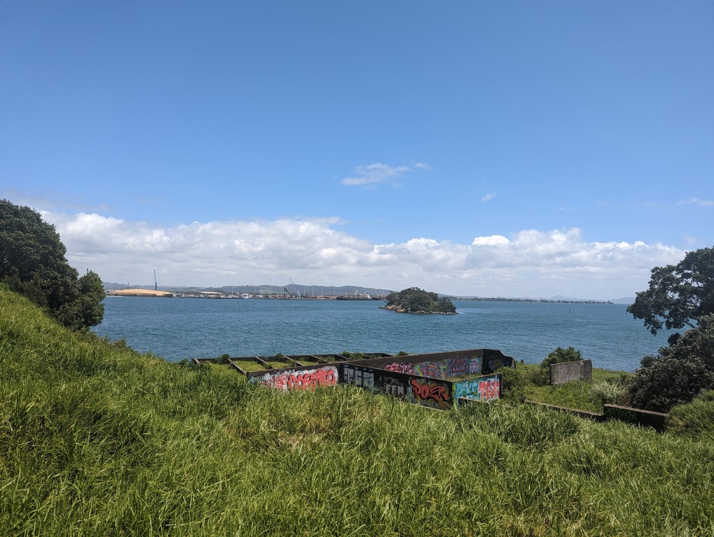 Il s’ensuit environ 2h de marche le long de la route sous un soleil de plomb jusqu’à Whangarei Heads qui constitue le côté nord de l’entrée du Whangarei Harbour. Entrée de port que nous devons traverser d’une façon ou d’une autre. Malheureusement (?) il n’est pas possible de la traverser à pied alors on fait appel à un watertaxi pour qu’il nous amène de l’autre côté à Marsden Point où trône fièrement une rafinerie désaffectée…