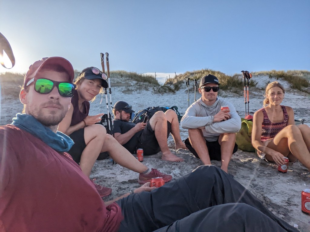 Vers 18:00 on se dirige gentiment vers la plage et on rejoint à 18:30 le lieu des 400km officiels de la marche ! On se pose encore un petit moment pour profiter du soleil couchant avant de se mettre en route vers le dernier river crossing. Ce dernier est très facile et ne dépasse pas les mi-mollets.