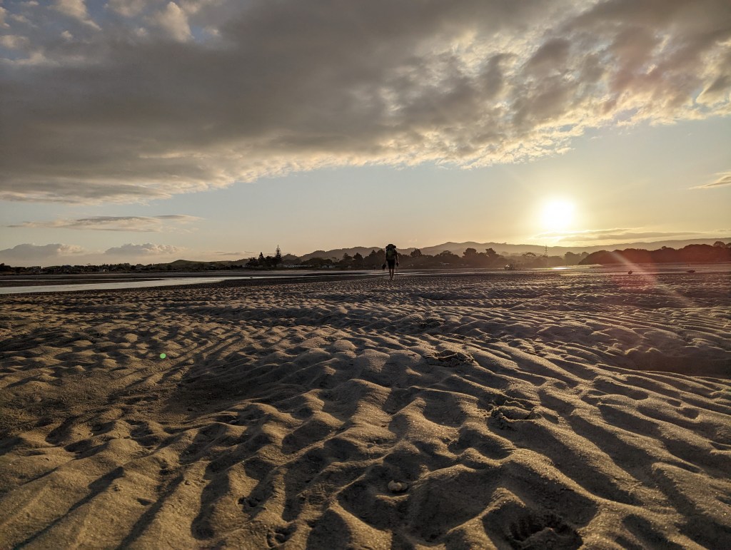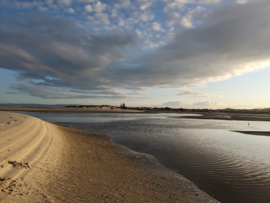 Vers 16:00 on atteint la ville de Ruakaka où nous faisons un mini resupply et retirons un peu de cash pour la suite. Une fois ces courses terminées, on se pose devant le supermarché pour boire une binche un peu comme des clochards avant d’aller manger quelque chose au kebab-pizza du coin. On attend la marée basse de 18:30 pour traverser une rivière juste avant le camping où on prévoit de passer la nuit.
