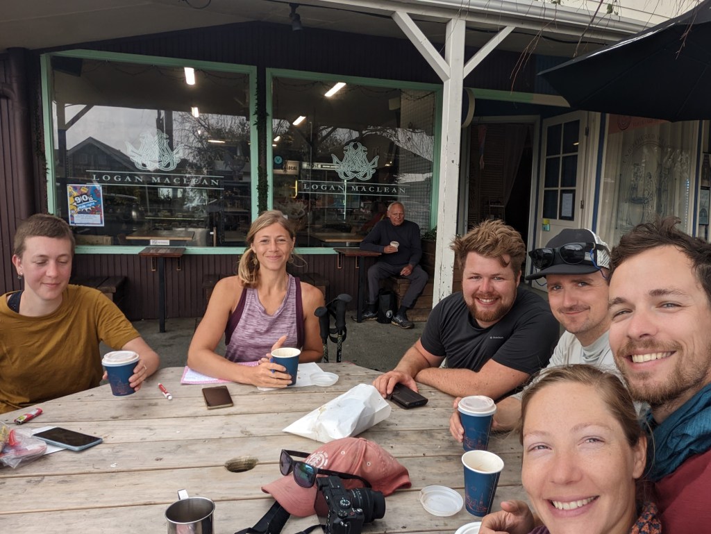 9:50 arrivée au centre de Waipu. C’est une ville assez sympa avec une petite influence écossaise car elle aurait été fondée par des écossais et des gens de Nouvelle-Écosse (des nouveaux-écossais ?). Il y a un café, le Logan McLean, qui offre un café (ou équivalent – un chai latte dans notre cas 😉) gratuit au TA hikers ! Quelle générosité ! On en profite quand même pour se prendre une délicieuse pâtisserie au passage. En attendant d’être servit, je remarque que le barista porte une casquette d’Alinghi sur sa tête (équipe suisse de voile qui a gagné 2 coupes de l’America au début des années 2000, les deux fois contre Team New Zealand). Je ne peux pas m’empêcher d’aller lui en parler et il semble très gêné de la porter car il semble être lui-même un kiwi mais je le rassure en rigolant que ça lui va très bien et qu’il faut qu’il la garde.