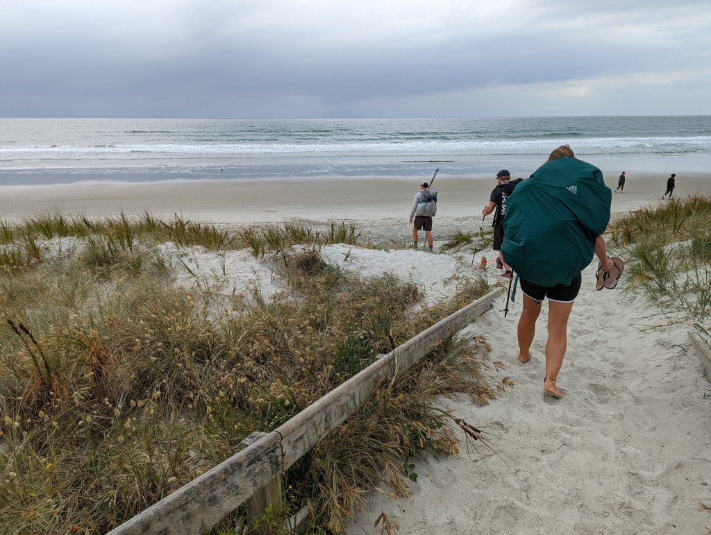 7:40 départ pour Waipu, une petite ville à environ 10km de notre camp dont 6km sur la plage. Le temps se dégage un peu et la petite pluie s’arrête. C’est parfait !