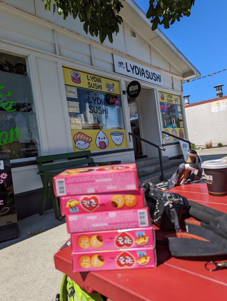 14:40 on est de retour au centre ville et on manque de peu la fermeture du café où on aurait volontiers repris un chai. Quel manque de pot mais tant pis. On part à la recherche d’un endroit où manger mais presque tous les shops sont maintenant fermés. Heureusement on tombe sur un petit magasin de sushi super sympa et délicieux. Les autres vont dans une boulangerie juste à côté et reviennent avec des snacks à l’aspect peu appétissant. D’après la réaction de nos compagnons le goût semble correspondre à l’aspect des aliments ^^ Nous on repart pour une seconde fournée tellement on a apprécié nos sushis. Alors que je repasse commande, les cuisinières, elles-mêmes japonaises, me demandent ce qu’on fait et d’où on vient. Elle sont très surprises par les deux réponses 🙂 Elles nous offrent même une grosse pièce de sushi en plus et je retourne m’assoir vers nos amis. Quelques minutes plus tard une des dames sort avec 5 petites boîtes de biscuits japonais et nous les offres ! Et encore a peine plus tard on reçoit 3 pièces de sushi supplémentaires à se partager car elles vont fermer sous peu et c’est ce qui restait. Tant de gentillesse !
