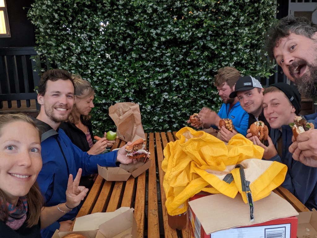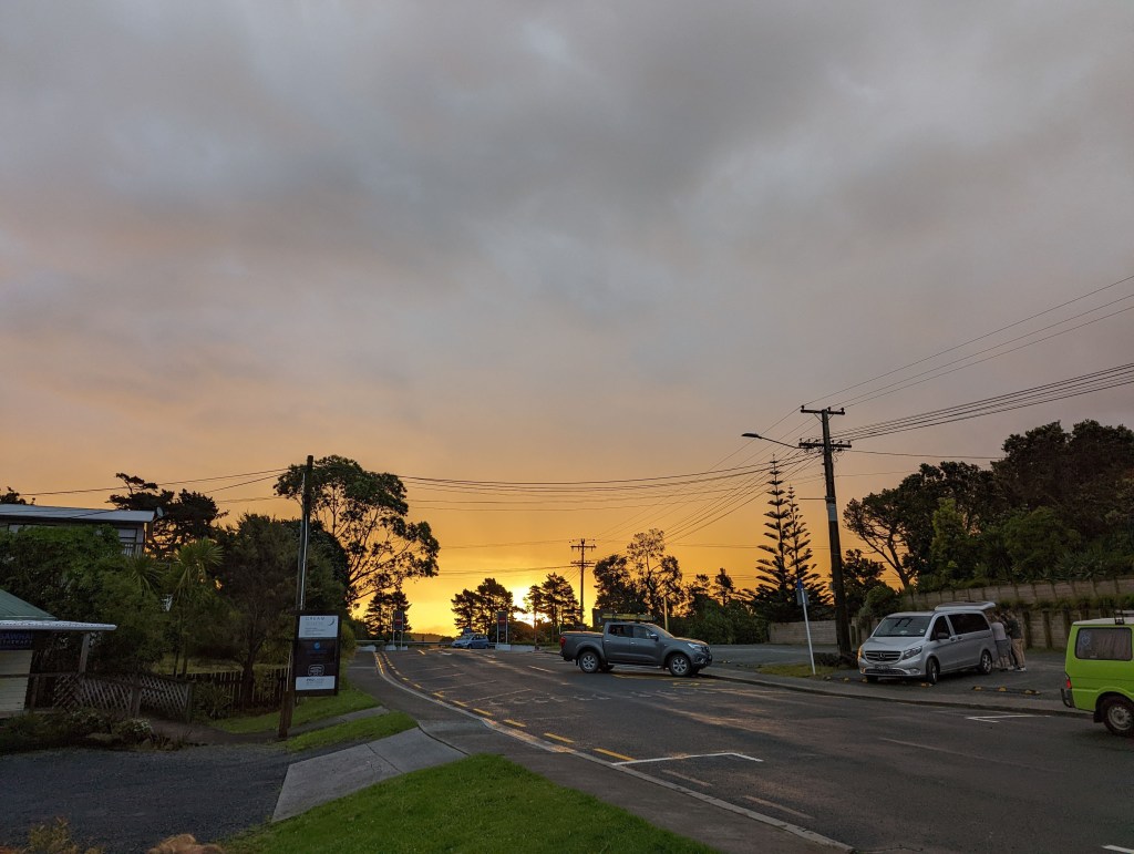Vers 19:00 avec le ciel qui se dégage on se motive à aller chercher un burger en ville à 20min de la maison. Avec ça on a droit à un magnifique coucher de soleil pendant qu’on attend de pouvoir emporter nos burgers.
