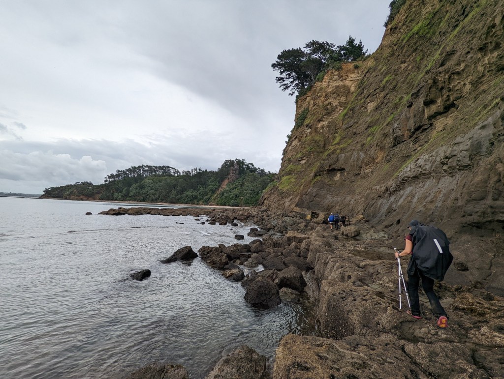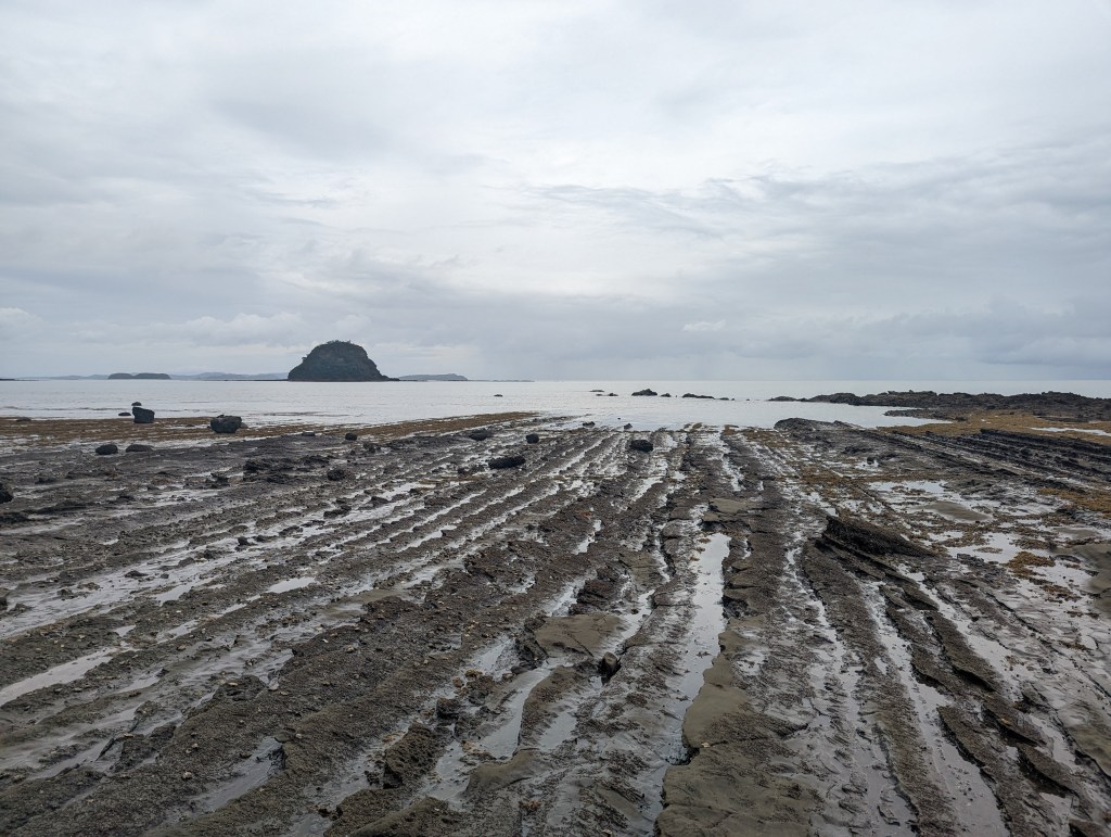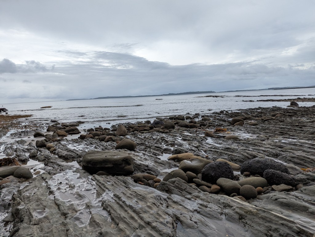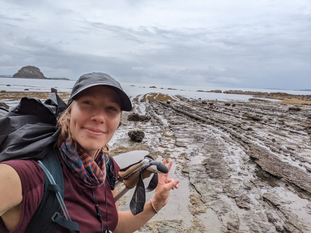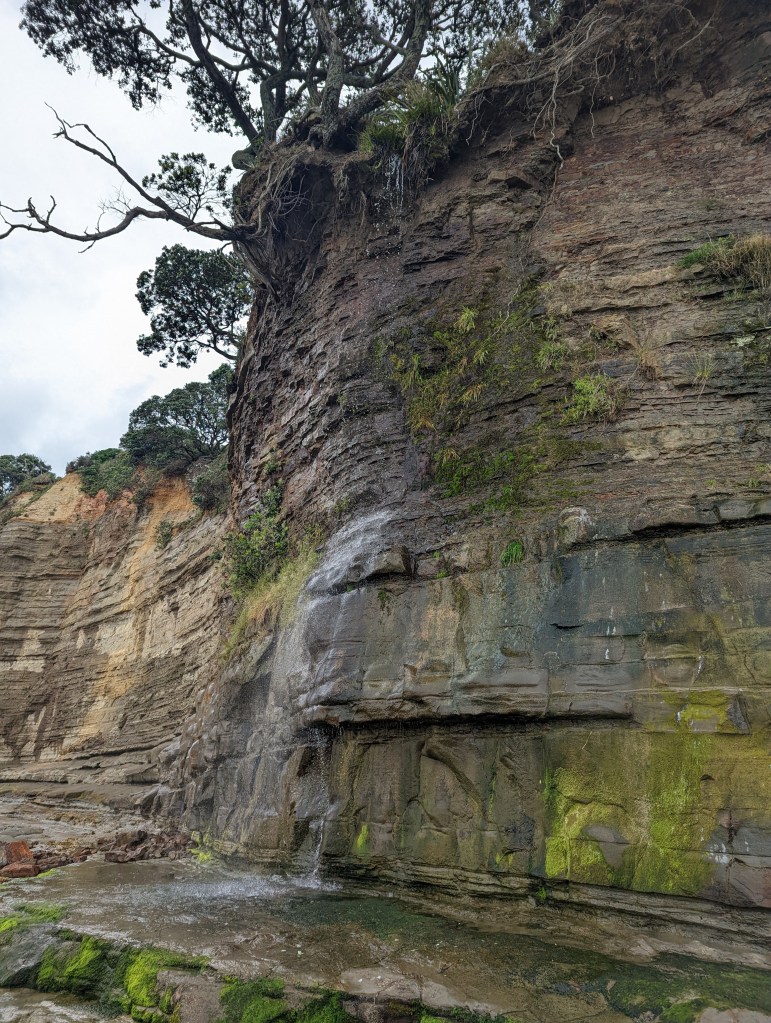 8:35 on s’y met pour de vrai. Aujourd’hui c’est 32km qui nous attendent avec pas mal de route et un peu de chemin côtier. Après 1h30, on passe près d’un petit Dairy (c’est le surnom local pour ce genre de petite épicerie de coin de rue) où on se sert d’une petite glace pour se faire plaisir avant l’itinéraire côtier. Ce dernier est super joli et passe au pied de falaises aux couleurs multiples. Et tout ce trajet se fait sans pluie !!