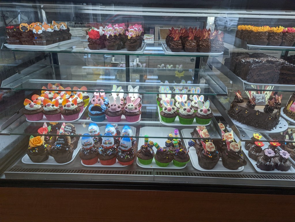 We finally continue towards the center of the small coastal town of Mairangi Bay to get something to eat at a supermarket but once there we decide to go to a bakery instead in which we try a surprisingly delicious butter chicken pie. The fact that we are very humid and that they are hot surely skews our opinion. We also take lemon tartlets which are however very disappointing with very little taste. This good 40min break allows us to avoid a huge 10min downpour.