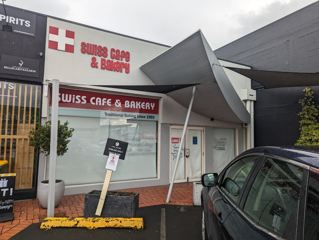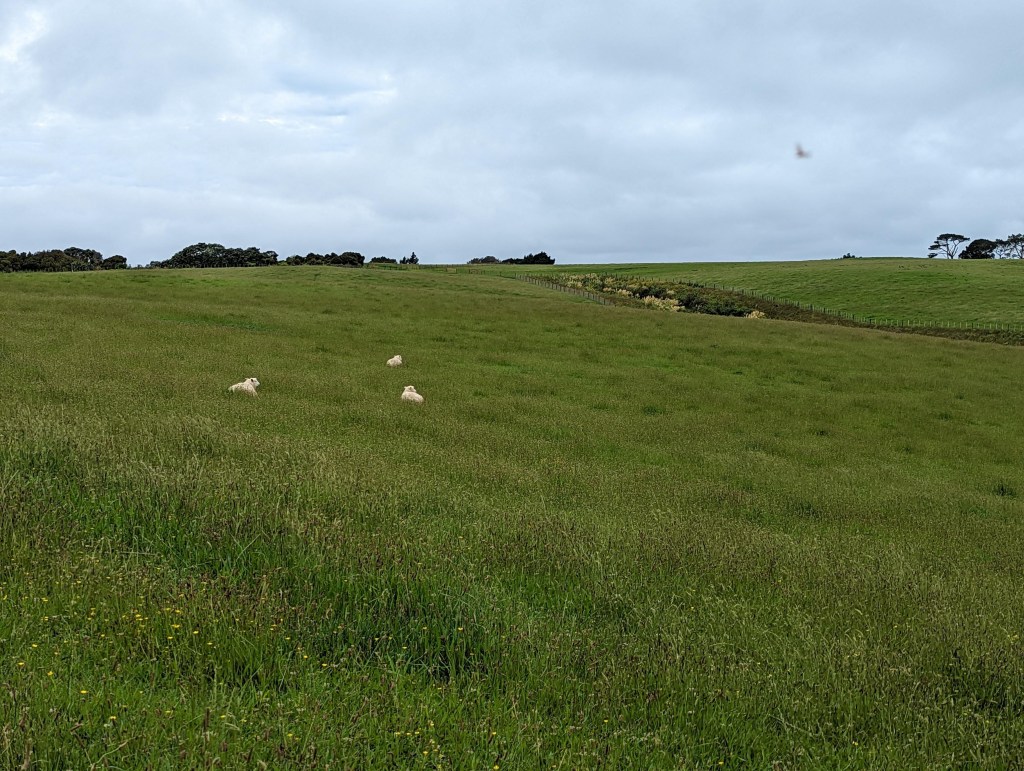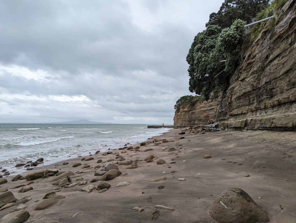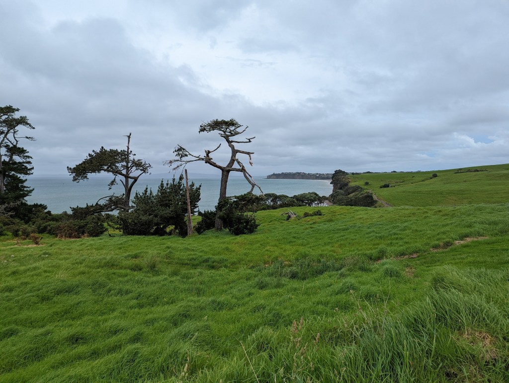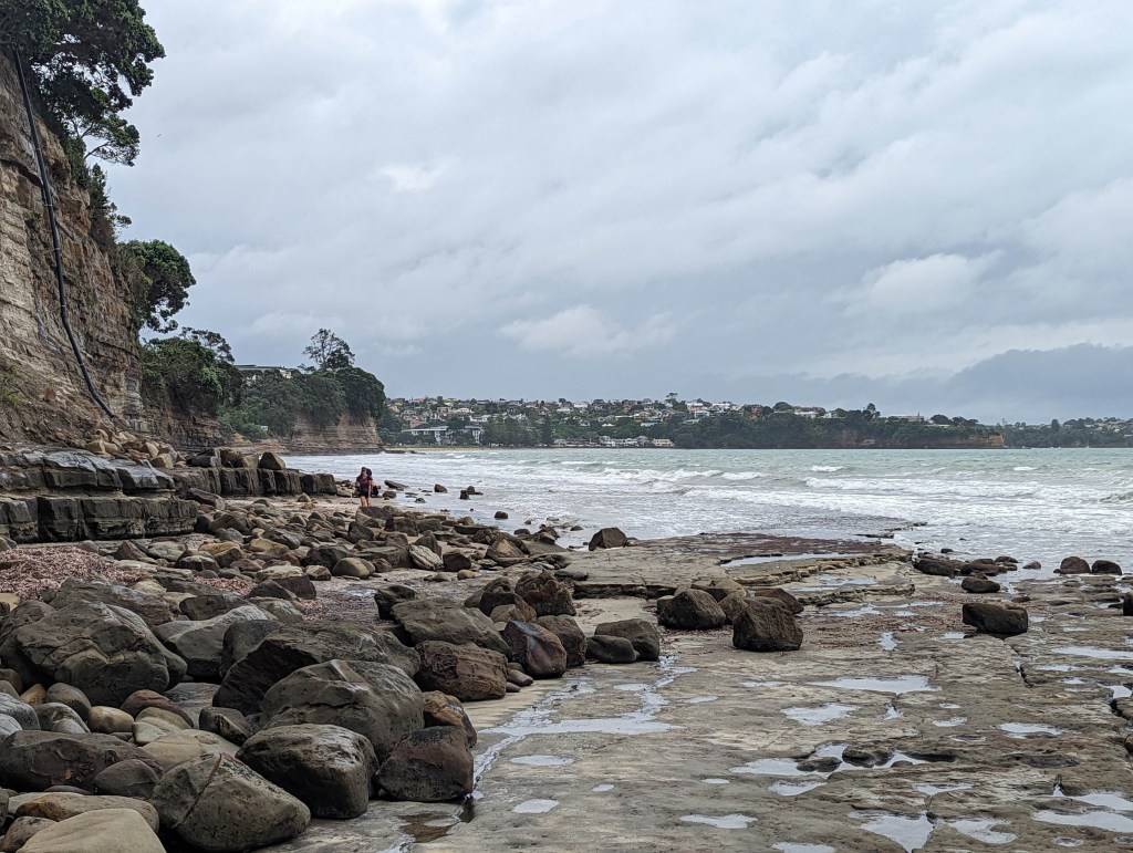On continue finalement en direction du centre de la petite ville côtière de Mairangi Bay pour aller chercher à manger. Une fois sur place on décide de plutôt passer dans une bakery dans laquelle on essaie un butter chicken pie étonnement délicieux. Le fait qu’on soit bien humide et qu’ils soient chaud biaisent sûrement notre avis. On prend aussi des tartelettes au citron qui sont par contre très décevantes avec très peu de goût. Cette bonne pause de 40min nous permet d’éviter une énorme averse de 10min.