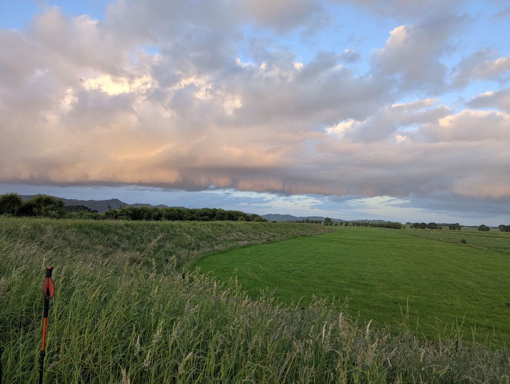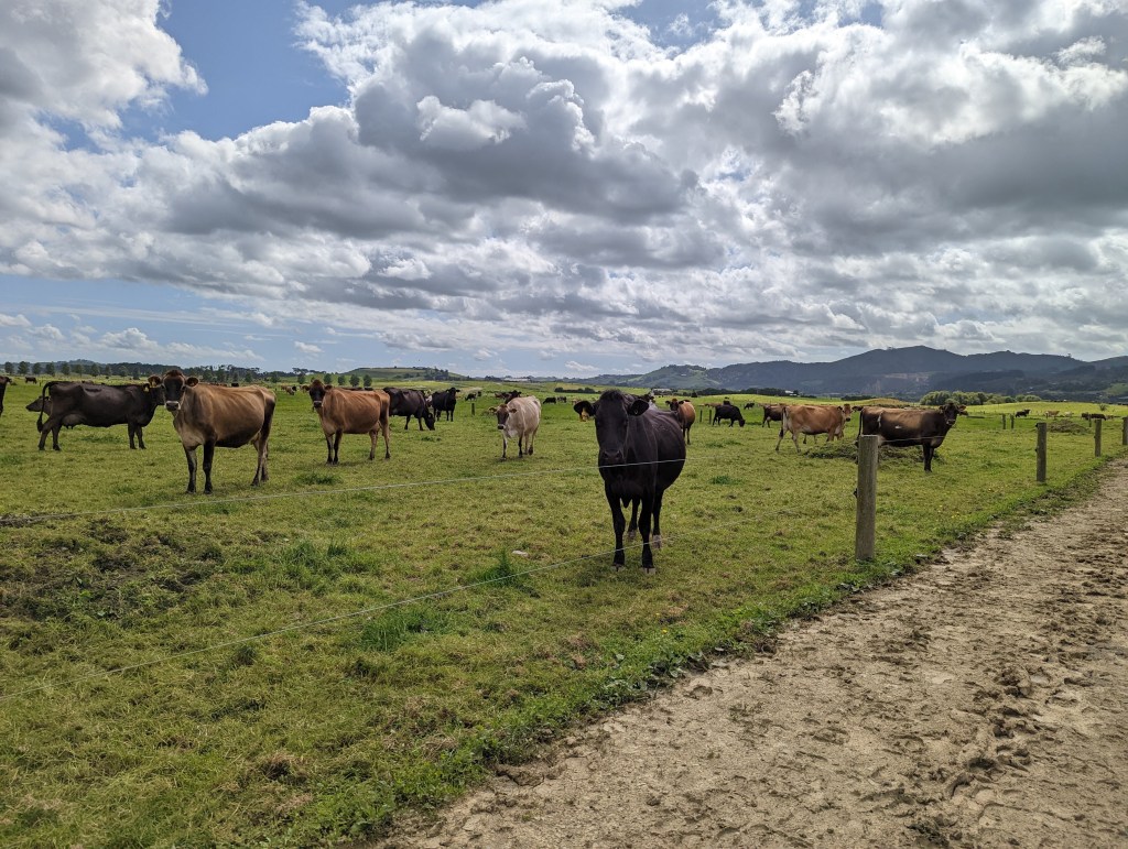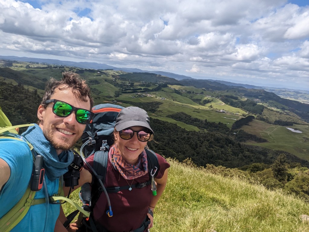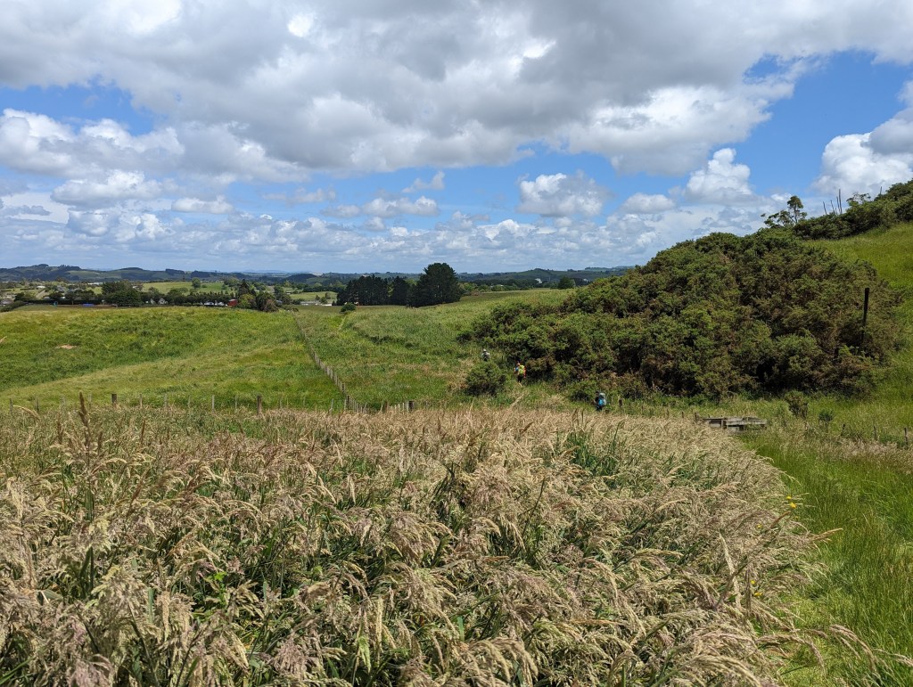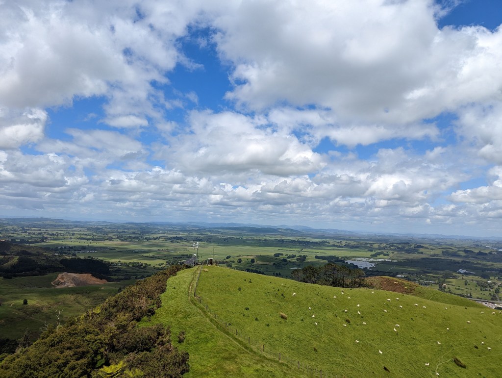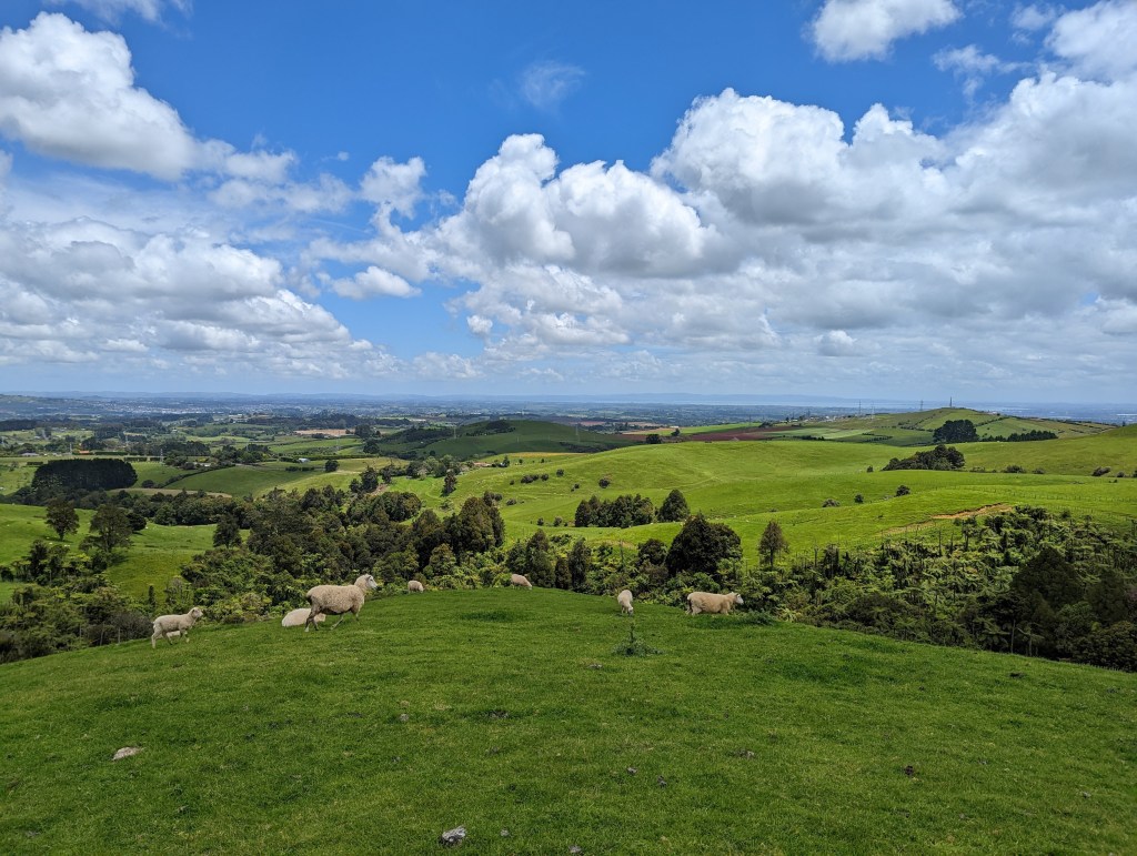 Après une bonne heure on s’y remet pour gravir la dernière montée jusqu’au sommet du Mount William (373m) d’où la vue est magnifique sur la campagne d’Auckland. Après quelques minutes, on commence à descendre avec Kat et Max qui ont fait leur pause de midi au sommet. La descente passe par une jolie forêt avant de rejoindre une route de campagne puis une grosse route en bitume.