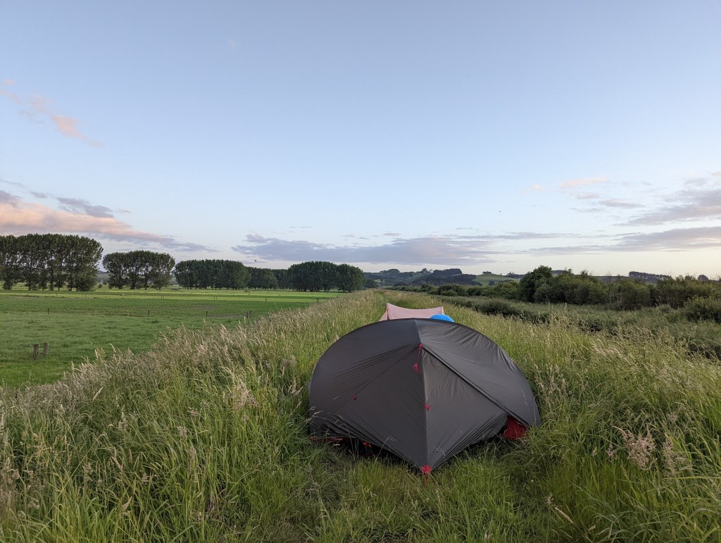 At around 6:30 p.m., after going around these enclosures and this river, we set up in wild camping on a dike between the flooded river and pastures. Neele and Sean decide to continue to the next town, Mercer 5km further, to pitch the tent in the garden of a local motel. Gijs stays with us and we are also joined by Kat and Max. We quickly cook dinner before going to bed with the setting sun. A long night will do us a lot of good after all those kilometers.
