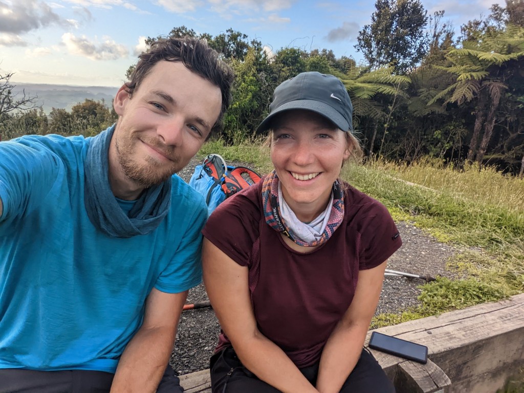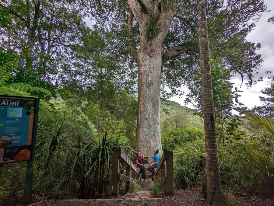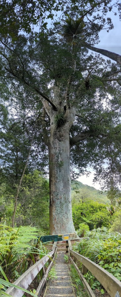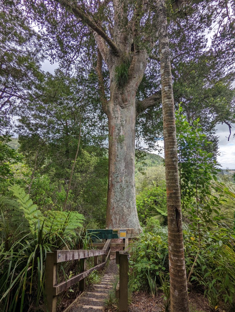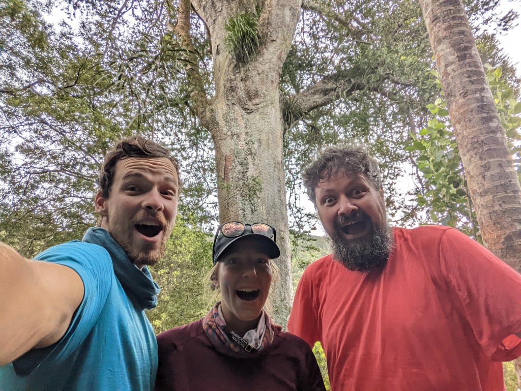 À 15:00 on arrive au pied de la Hakarimata Range, qui est une petite chaîne montagneuse couverte d’une jolie forêt. On y retrouve Max, Roxann et Jamie qui font une pause avant de se lancer dans la forêt. Étant donné qu’on est déjà assez bien reposé, Aaron et nous commençons la montée avec Mag’ qui mène la danse 😊. Après une 20aine de minutes on fait un détour pour voir un très vieux et énorme Kauri d’environ 1000ans ! Il est surnommé “The last Kauri” car il est inexplicablement le seul a avoir échappé à la coupe massive des Kauri lors du 19ème siècle. Aaron estime que c’est l’occasion de partager une bière qu’il a emporté avec lui pour notre plus grand plaisir. Alors qu’on fini notre détour on retombe sur Roxann avec qui on continue la traversée de la forêt.