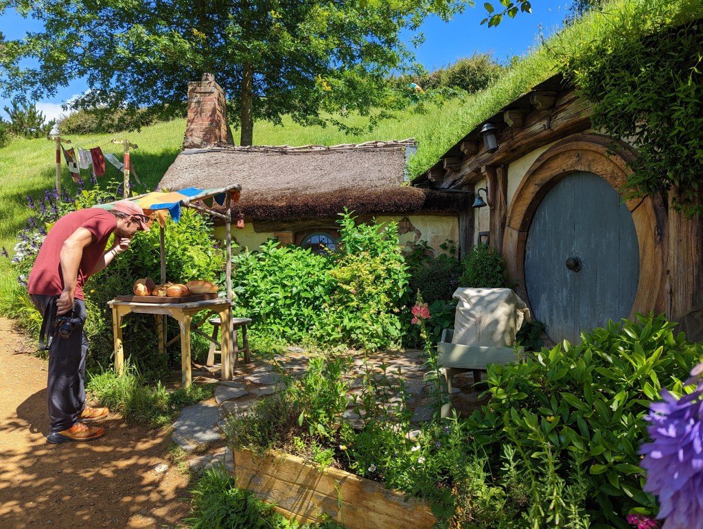 Puis c’est visite du set avec notre guide très fun et aussi évidemment une grande fan de l’univers de Tolkien. On apprend que chaque trou de hobbit est décoré selon une activité professionnelle/hobby différente. Par exemple il y a le boulanger, le fromager, l’apiculteur, etc. En plus de ça, la quasi totalité de la végétation et de la verdure qui pousse est vraie. Ce sont donc de vrais légumes que nous voyons pousser sous nos yeux. Légumes que les jardiniers employés peuvent ramener chez eux une fois mûrs 😄
