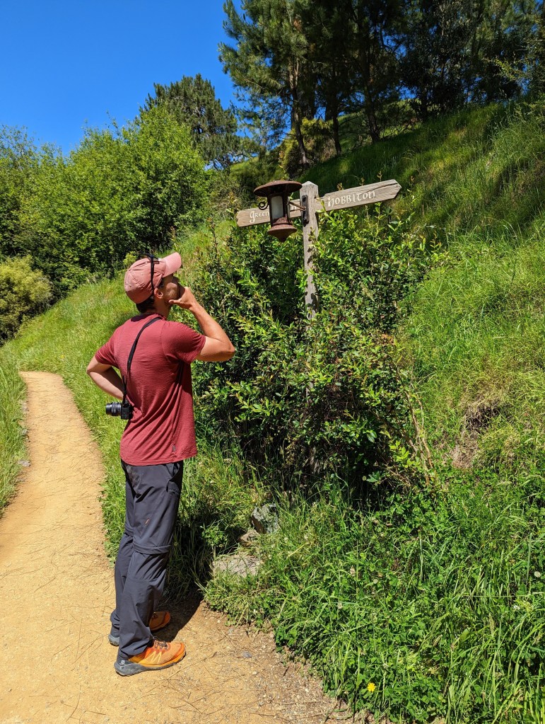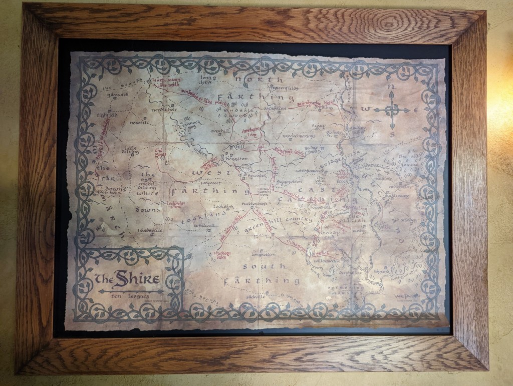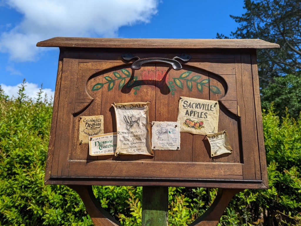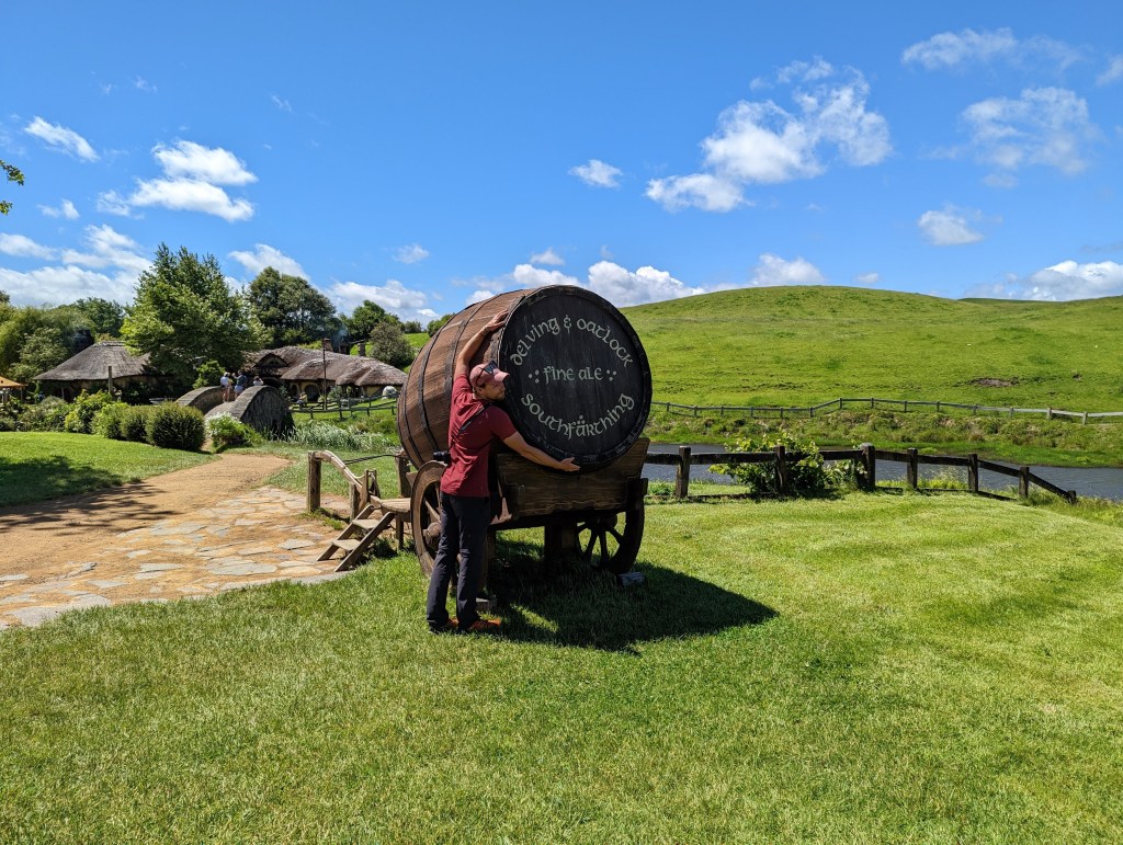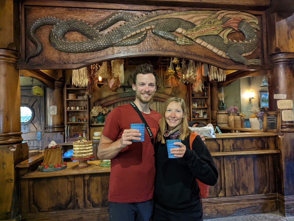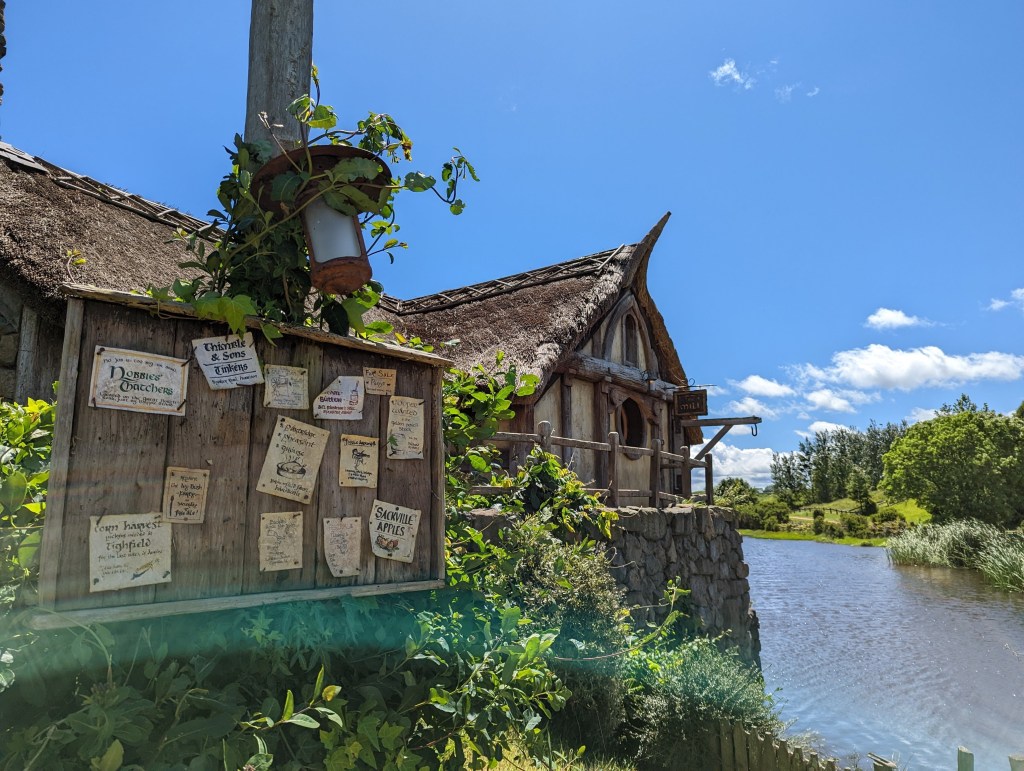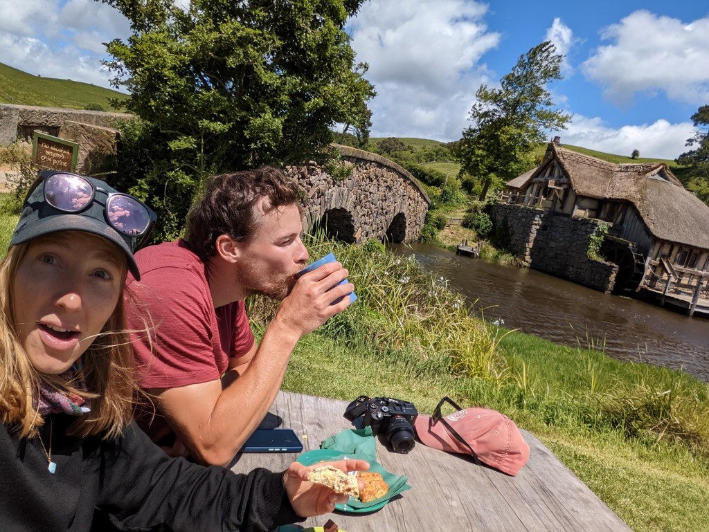 Après avoir traversé Hobbiton, on termine la visite au Green Dragon Inn où une boisson (typiquement une bière) est offerte. La bière serait apparemment brassée spécialement pour Hobbiton. On prend aussi de quoi grignoter car il est maintenant midi et la faim se fait sentir. Puis après avoir visité l’auberge on se pose dehors sur un banc devant l’entrée de l’auberge.