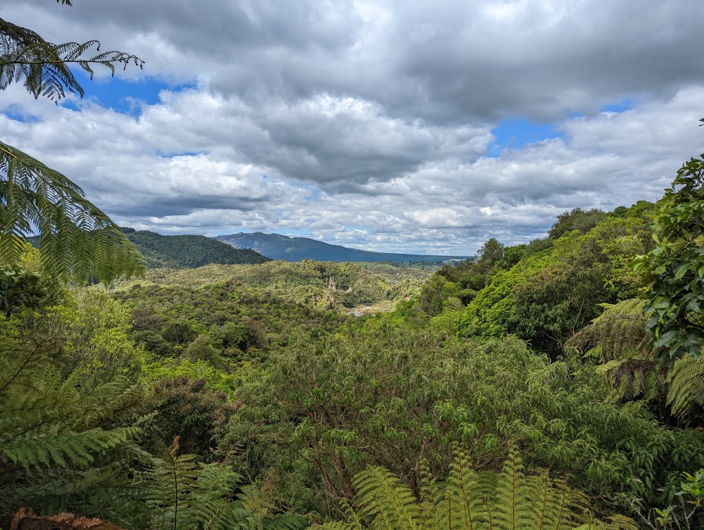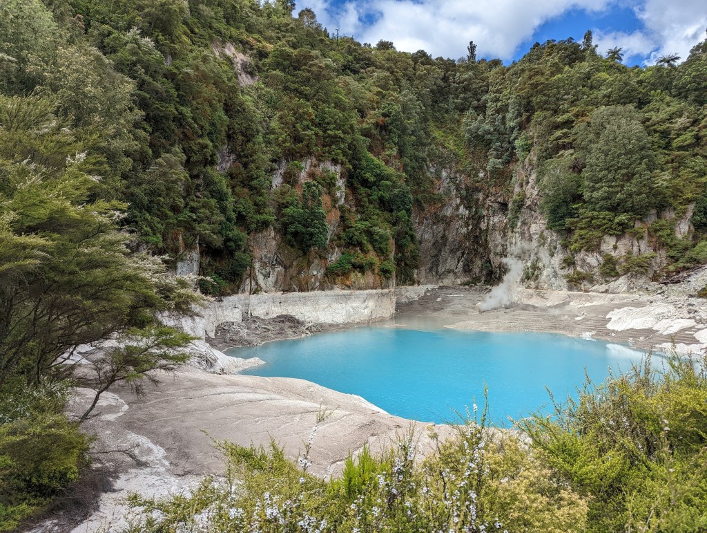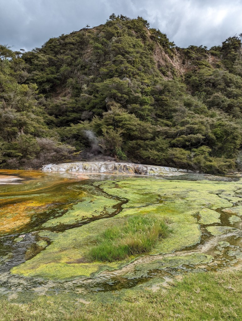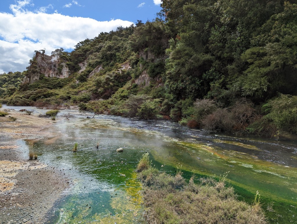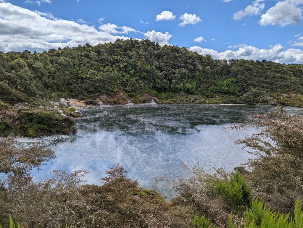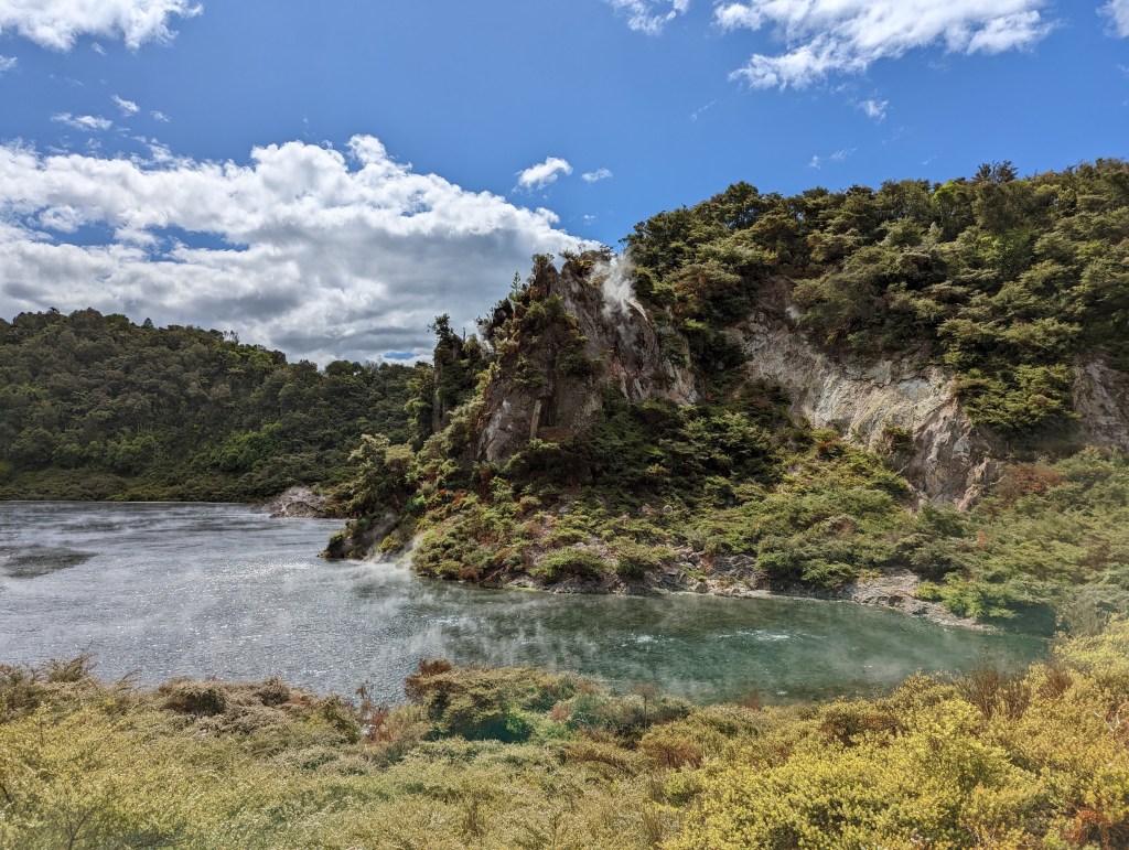 Une fois sortis du parc, on se met en route pour rejoindre nos amis restés sur Rotorua pour aller visiter la Volcanic Valley. Un lieu avec une intense histoire pleine d’éruptions et avec des lacs d’eau brûlante et sulfureux. On le parcours en vitesse car nous sommes proche de l’heure de fermeture. Du coup, Sean qui tient le petit fascicule décrivant les différents lieux importants, prend le rôle de guide et nous lit en accéléré les informations écrites 😆 On sait dans quel domaine il peut se reconvertir si nécessaire 😜 Mais dans l’ensemble cette vallée n’est pas aussi folle que ce que sa description pourrait laisser imaginer…