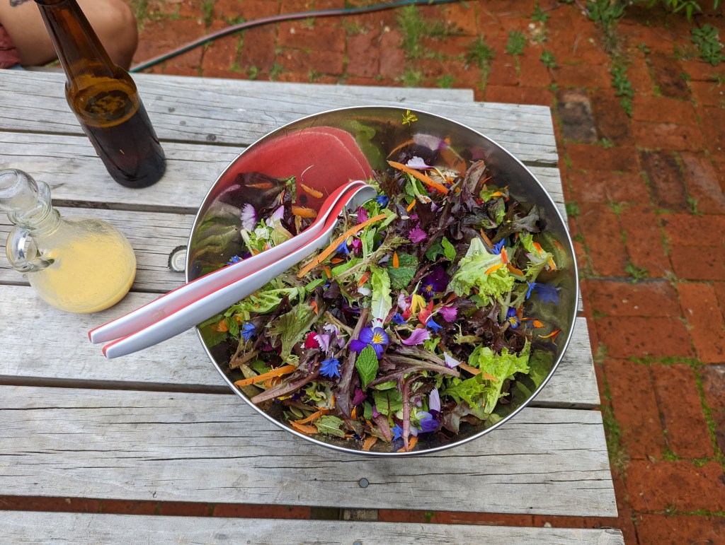 On est reçu par la propriétaire (on campe chez des privés) qui nous laisse nous installer tranquille dans le jardin. Elle nous a aussi préparé une grande salade à partager et du pain frais qu’elle a cuit elle-même ! Sur place, on a aussi accès à une douche chaude et à des bières à prix libre (tout comme la place de camping). C’est le rêve surtout après la plaisir qu’était la descente dans la forêt boueuse…