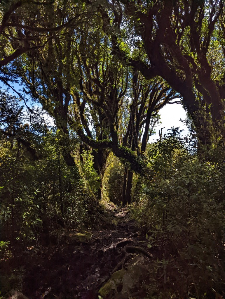 Toute la montée se fait dans une forêt magnifique dans laquelle il fait très frais malgré le soleil qui brille dans le ciel complètement dégagé. Mais on s’en plaint pas. Au contraire, c’est parfait pour marcher et surtout pour monter.