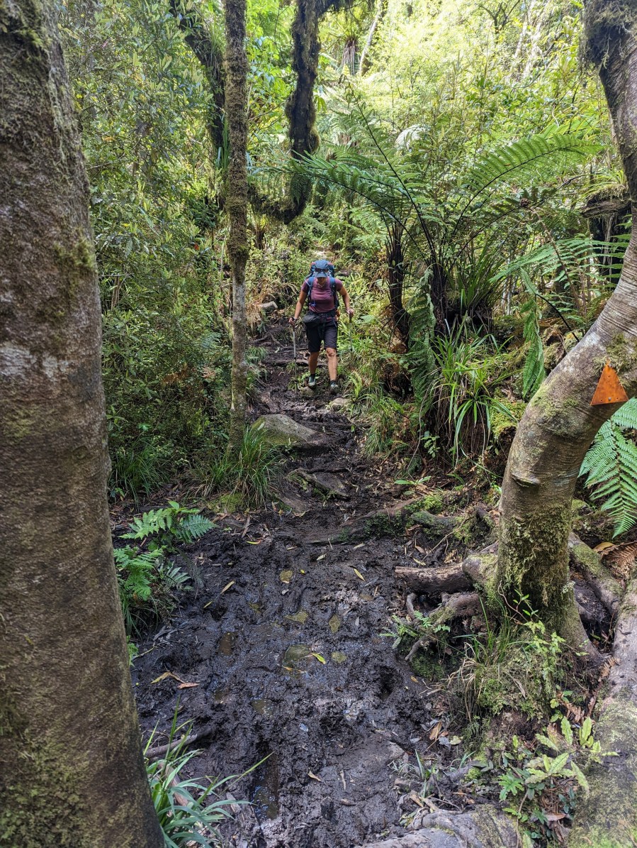 We stay there for a good hour before starting the 5 km “downhill” (there were a few very steep climbs before the end 😢 ) along the track with the best name encountered so far: the Hihikiwi Track.