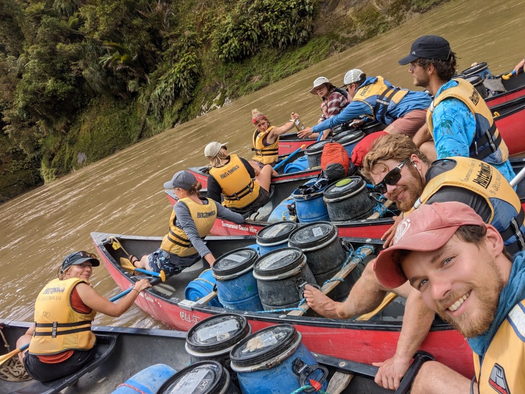 Une fois les canoës à l’eau, on se charge de retrouver nos bidons pour vérifier une dernière fois leurs contenus mais surtout pour enfin pouvoir les placer et les attacher dans un canoë. Au final Mag’ et moi partons avec 5 petits bidons étanches (pleins de nourriture et de nos vêtements) et un gros dans lequel se trouvent nos sacs à dos et quelques affaires ne craignant pas trop l’eau.