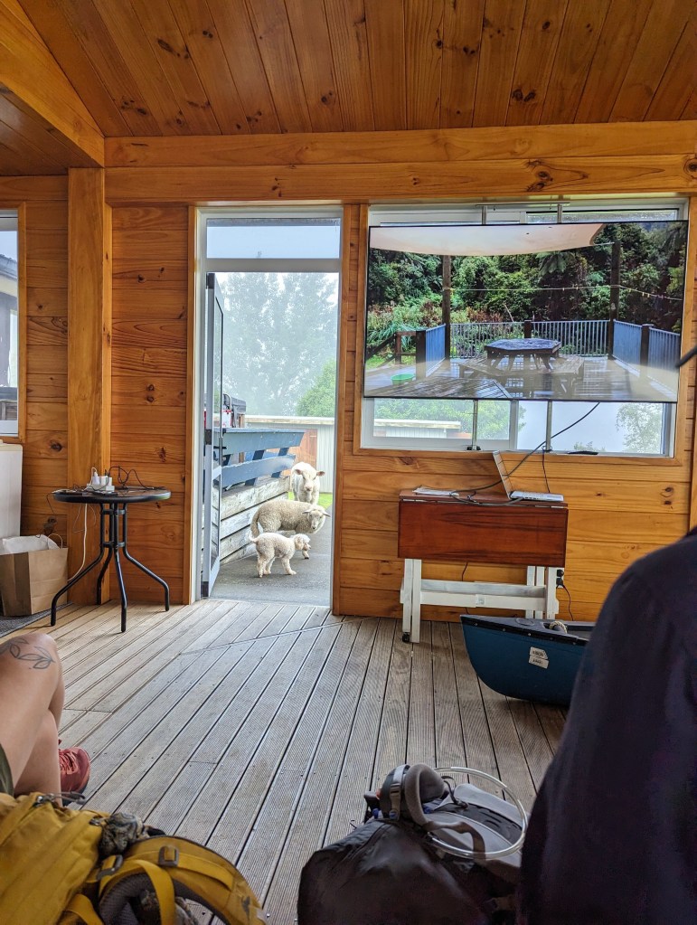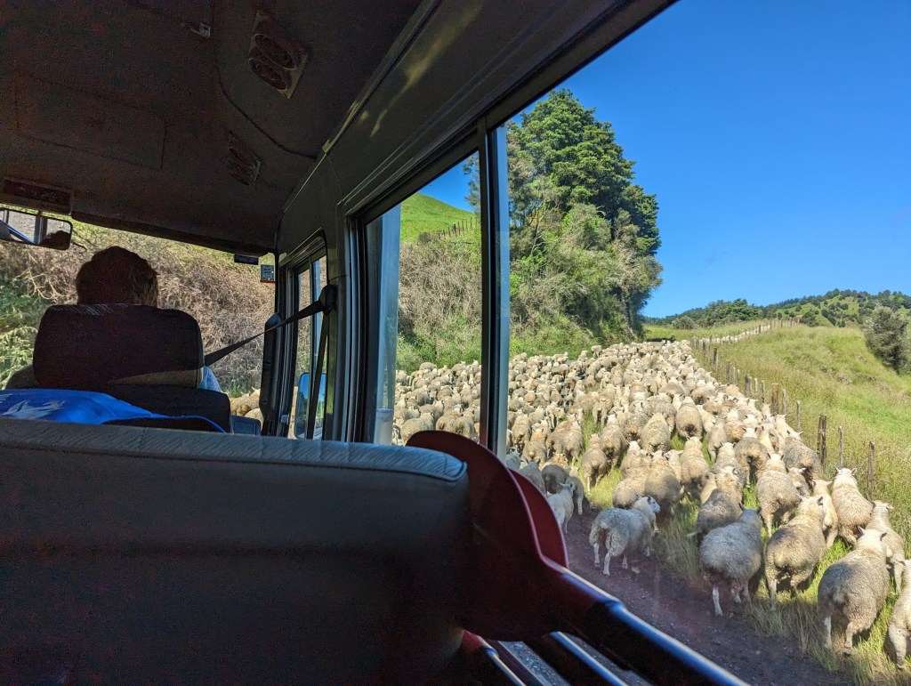 Et finalement, à 8:30 on embarque dans le bus qui nous amène à Whakahoro d’où notre aventure sur la Whanganui River va débuter ! Le trajet nous prend environ 1h30 avec un long bout dans la campagne le long d’une route sinueuse à flanc de montagne. On est d’ailleurs brièvement ralenti pas un énorme troupeau de moutons qu’on traverse tel Moïse dans la mer rouge 😂.