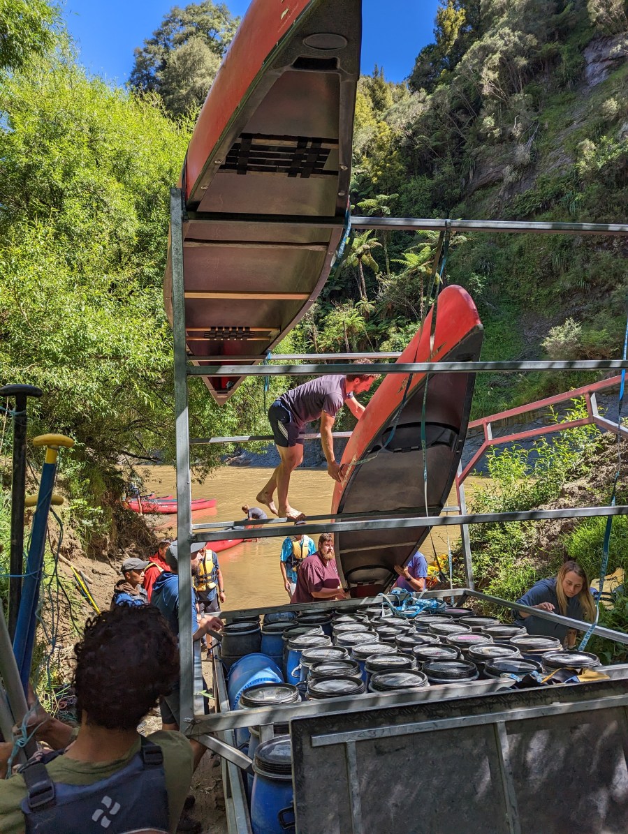 Everyone is doing their part to empty it as soon as possible. We feel that everyone is impatient to finally be able to go sail on the river. In total, more than twenty canoes are launched from two trailers (for about fifty people).
