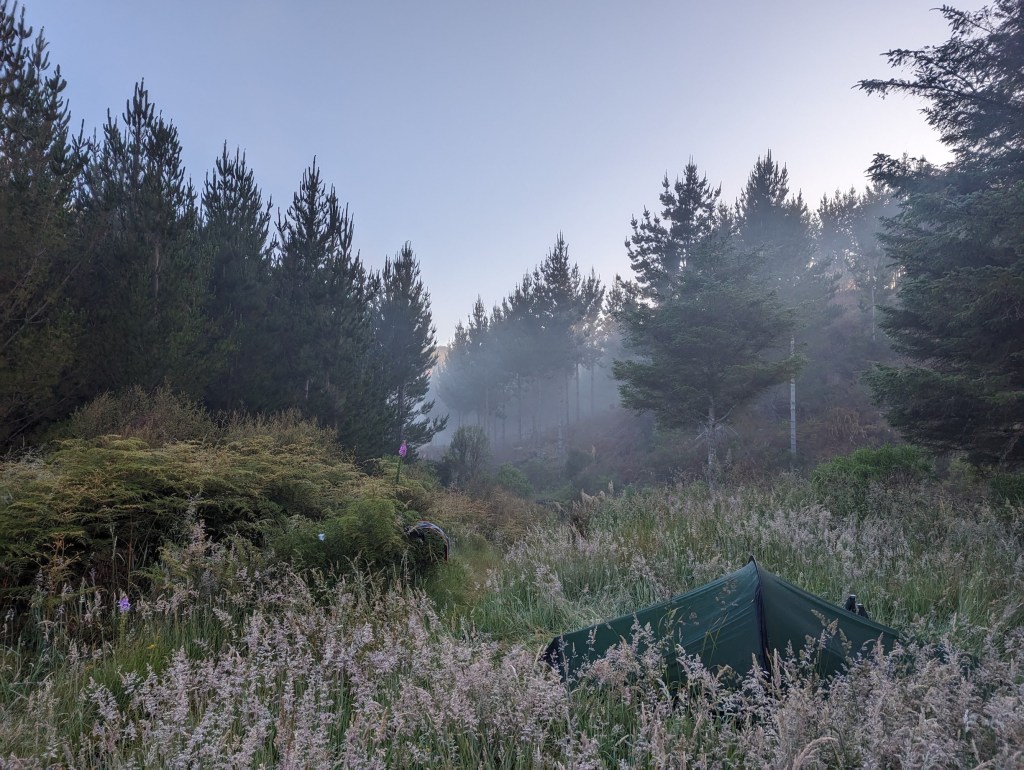 We are joined at around 4:00 p.m. by the kiwi couple, with whom we had briefly discussed the day before and who are doing the same route as us but only to the town of Levin, and Alec the American. And still a little later arrives Caroline, a Belgian girl, who also does the TA.