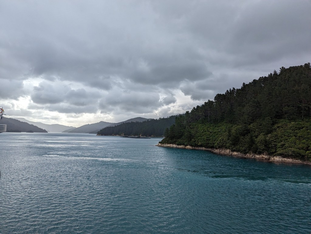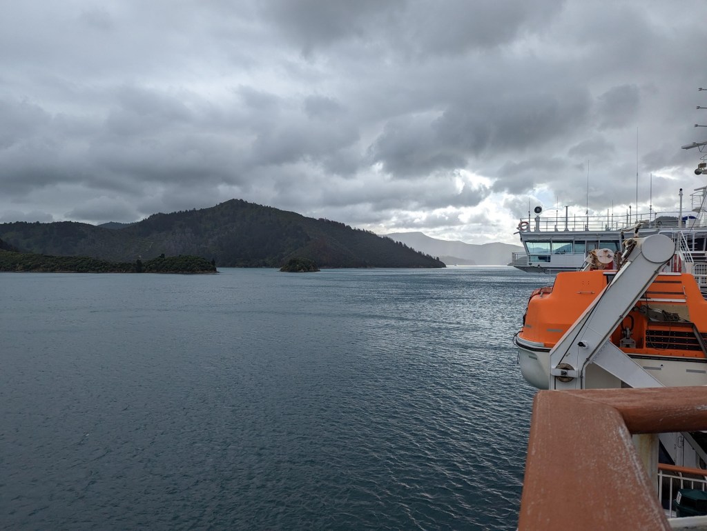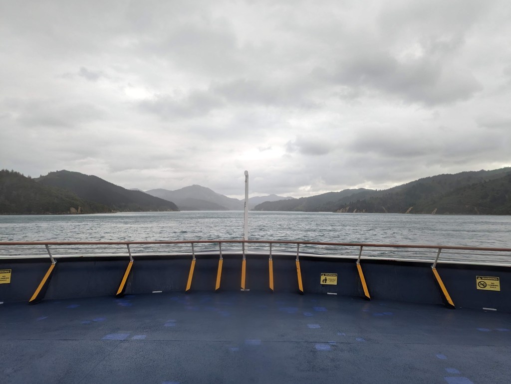 Il est 16:00 et le ferry largue enfin ses amarres. La météo est n’est toujours pas fantastique avec énormément de vent. Le capitaine nous annonce d’ailleurs que le trajet risque d’être un peu bumpy 😅. Ça se confirme une fois sorti de Wellington Harbour avec la houle qui grossit méchamment et le ferry qui se met à tanguer. Quand on marche dans les couloirs on a l’impression d’être sur une petite montagne russe. Mais une fois la vitesse de croisière atteinte, on ne sent heureusement plus trop les vagues.