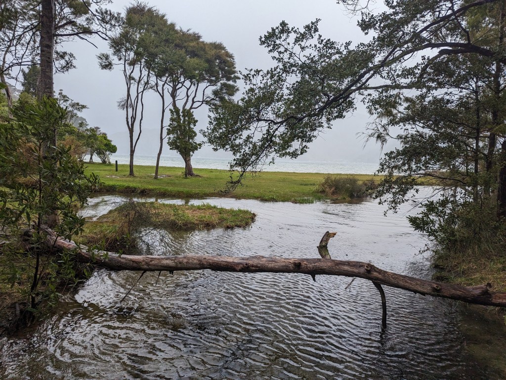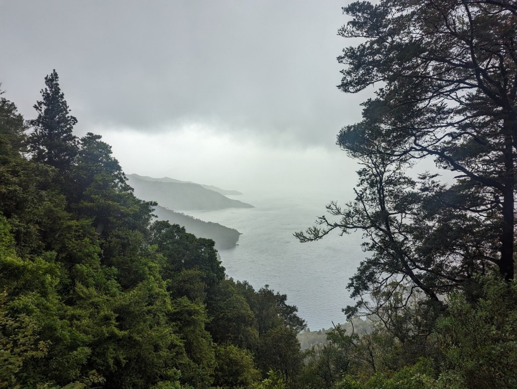 Malheureusement les paysages sont couverts pour la plupart par les nuages bas, mais de toute façon on a pas trop envie de trainer sous la pluie. Alors on fonce avec de la musique ou des podcasts dans les oreilles. On ne s’arrête pas non plus pour manger car il n’y a aucun abris en chemin pour se poser un moment à part Camp Davies qui était sensé être nos destination finale d’aujourd’hui 😅