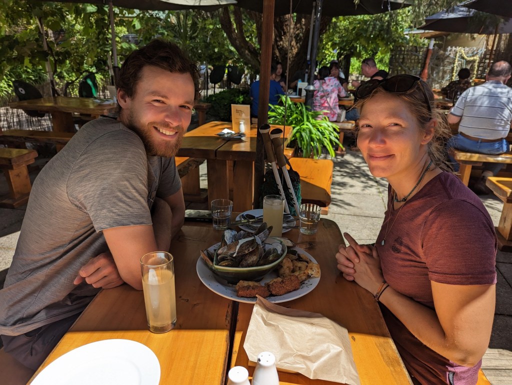 We then finish the day’s walk at around 12:30 in Havelock and decide to go for lunch before trying to hitchhike to Nelson. It turns out that this city is the green-shelled mussel capital of the world! So we have to go and taste some. To do this we go to a restaurant aptly named The Mussel Pot. We take a kind of tasting dish to share in which lots of mussels prepared in different ways are presented. And everything is really delicious! There, we also meet once again Odine and Stefano 😄.
