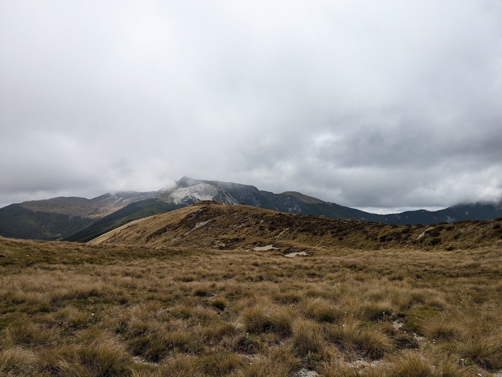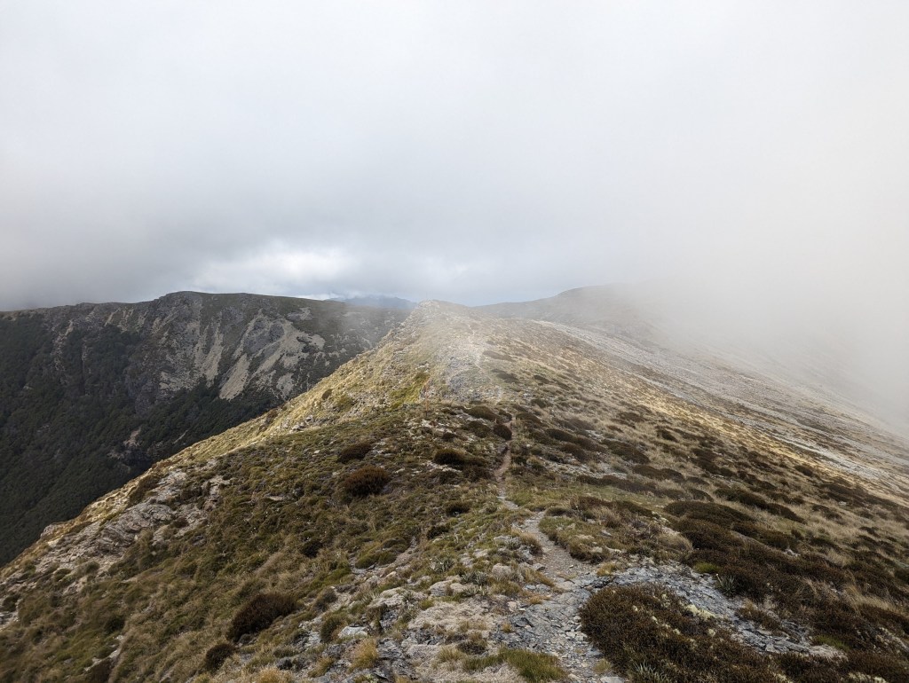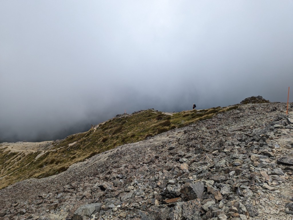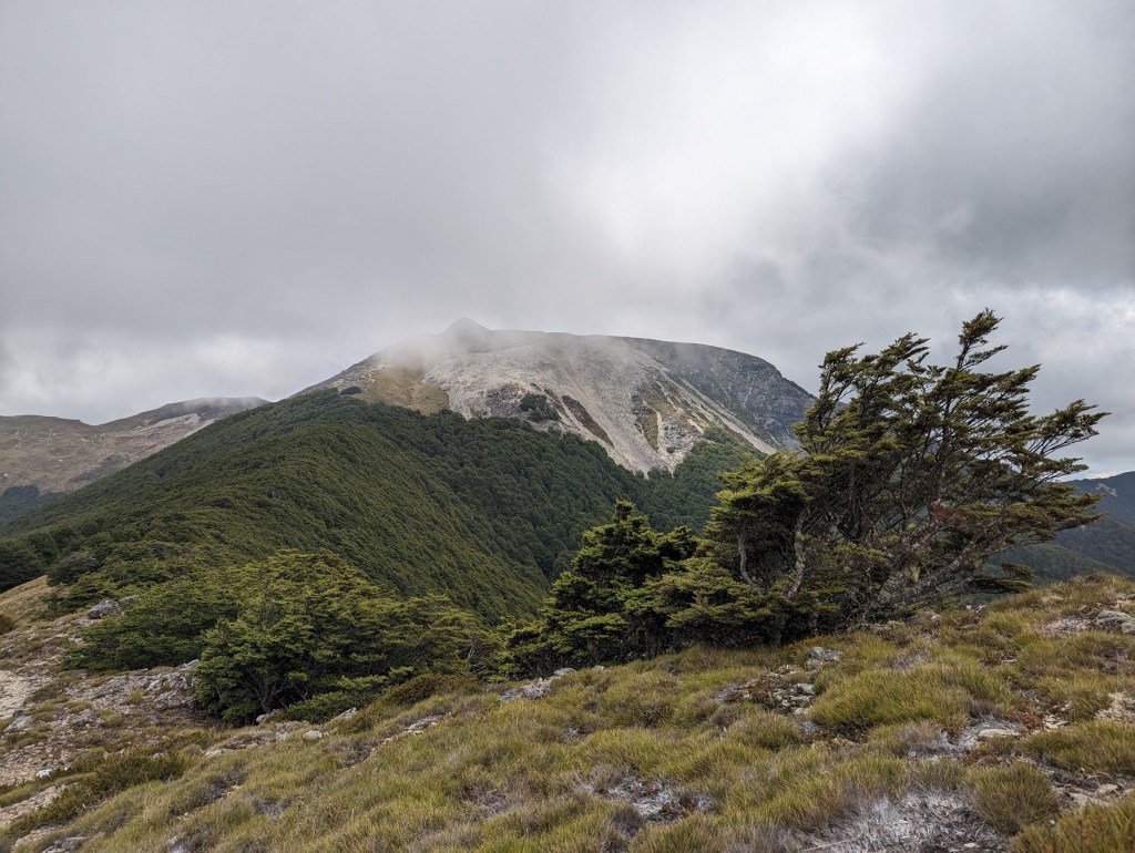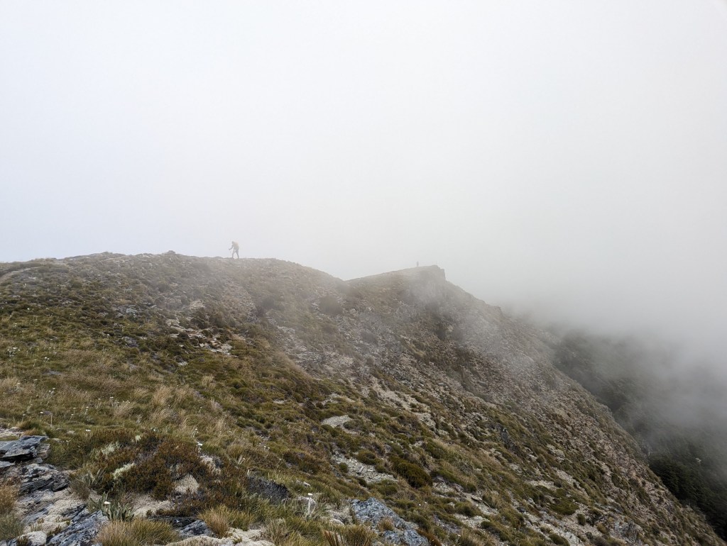 On quitte Slaty Hut vers 13:40 après notre lunch avec les autres. Il nous reste encore environ 8.3km mais avec encore 2 sommets à gravir entre deux. Pendant ce temps, le ciel se couvre, le vent forcit un peu et quelques nuages bas apparaissent sur notre chemin. Ces éléments en plus du dénivelé parcourus précédemment rendent l’ascension du dernier sommet – Old Man (1514m) – particulièrement rude.