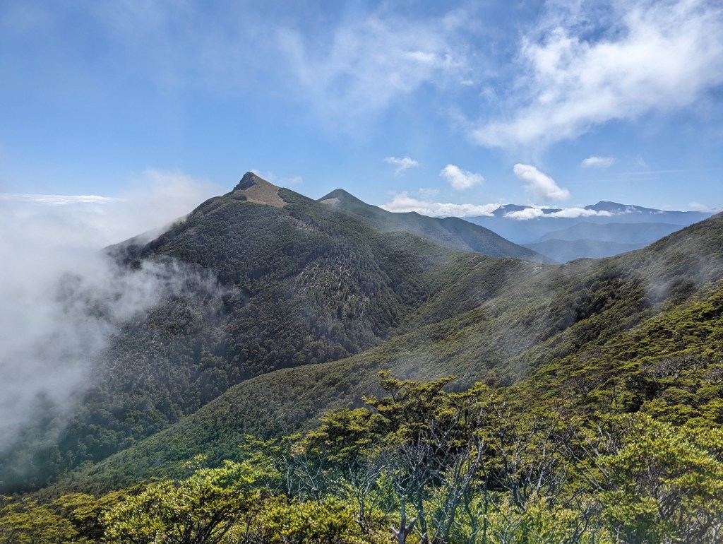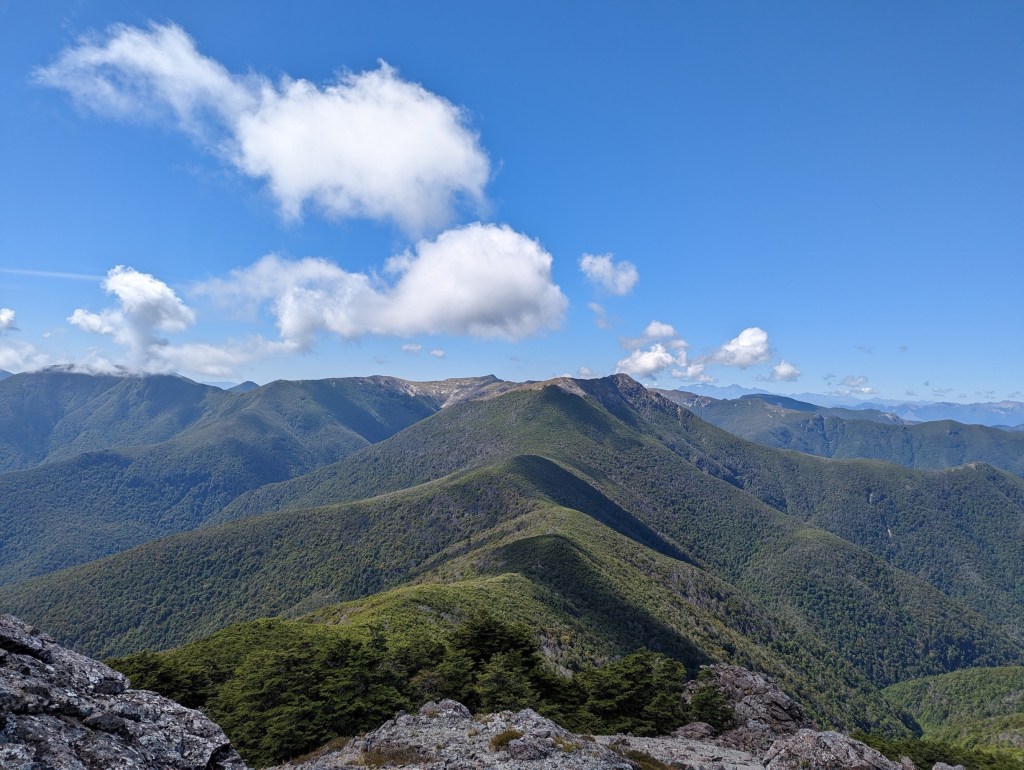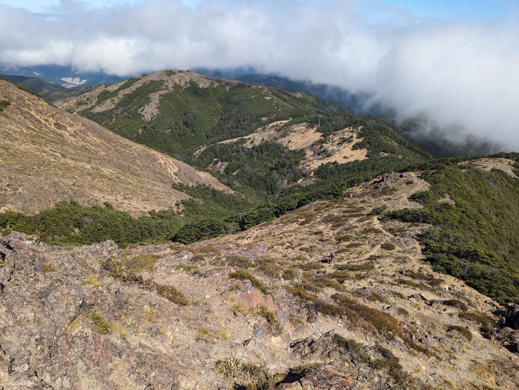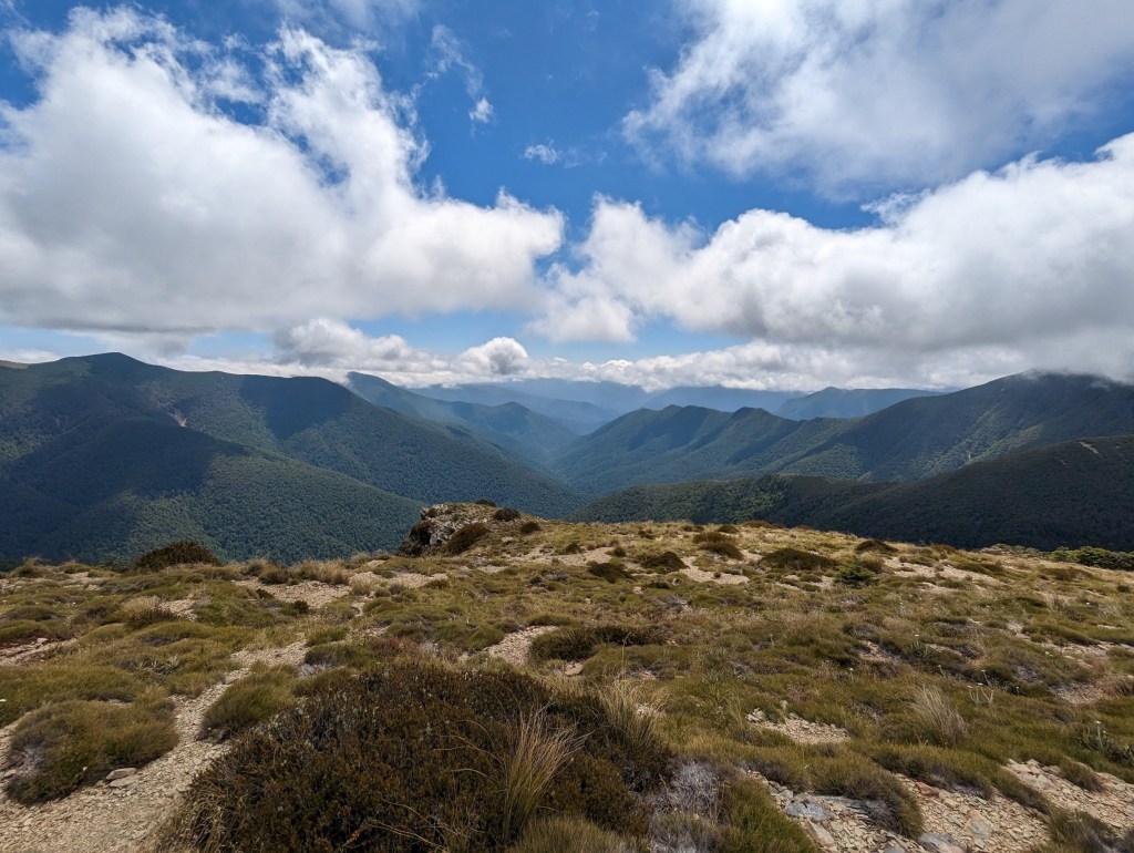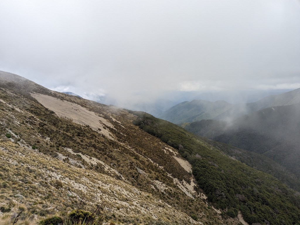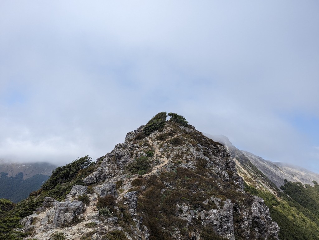 On quitte Slaty Hut vers 13:40 après notre lunch avec les autres. Il nous reste encore environ 8.3km mais avec encore 2 sommets à gravir entre deux. Pendant ce temps, le ciel se couvre, le vent forcit un peu et quelques nuages bas apparaissent sur notre chemin. Ces éléments en plus du dénivelé parcourus précédemment rendent l’ascension du dernier sommet – Old Man (1514m) – particulièrement rude.