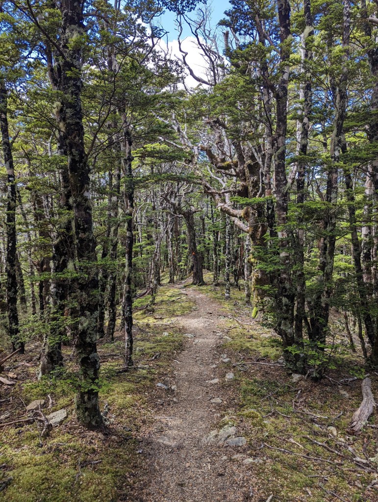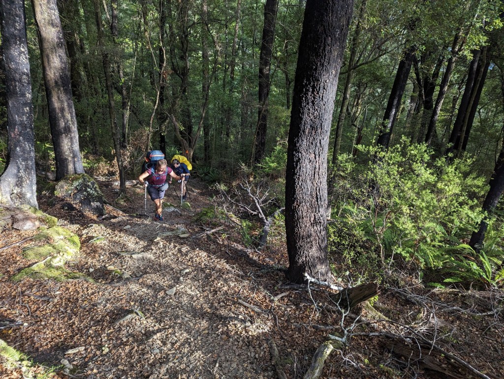 Après ça, les choses sérieuses commencent… C’est 930m de dénivelé à travers la forêt qui se dressent devant nous jusqu’à la prochaine hut 6km plus loin: Starveall Hut.