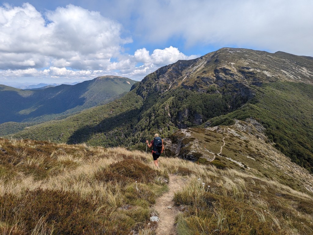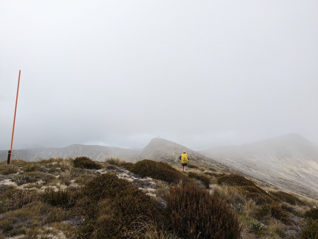 Alors qu’on est un peu en avant des autres, Josh et moi faisons un mini détour vers le sommet officiel car le sentier passe malheureusement juste à côté. Le sommet nous fait passer derrière une bosse qui nous cache brièvement du chemin officiel. C’est évidemment à ce moment-là que Mag’ passe sans nous voir alors que je croyais que si. Il s’en suit une course effrénée où j’accélère au point de presque courir dans les descentes pour tenter de la rattraper car je crains qu’elle ne s’arrête pas à la prochaine hut ne m’y voyant pas 😆