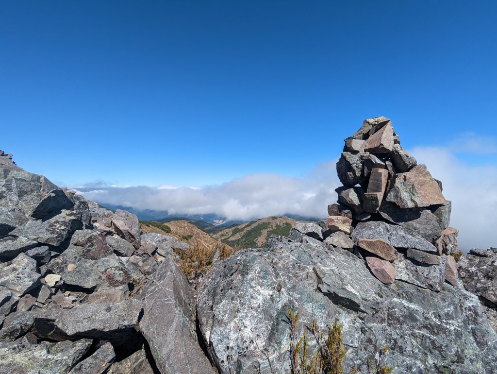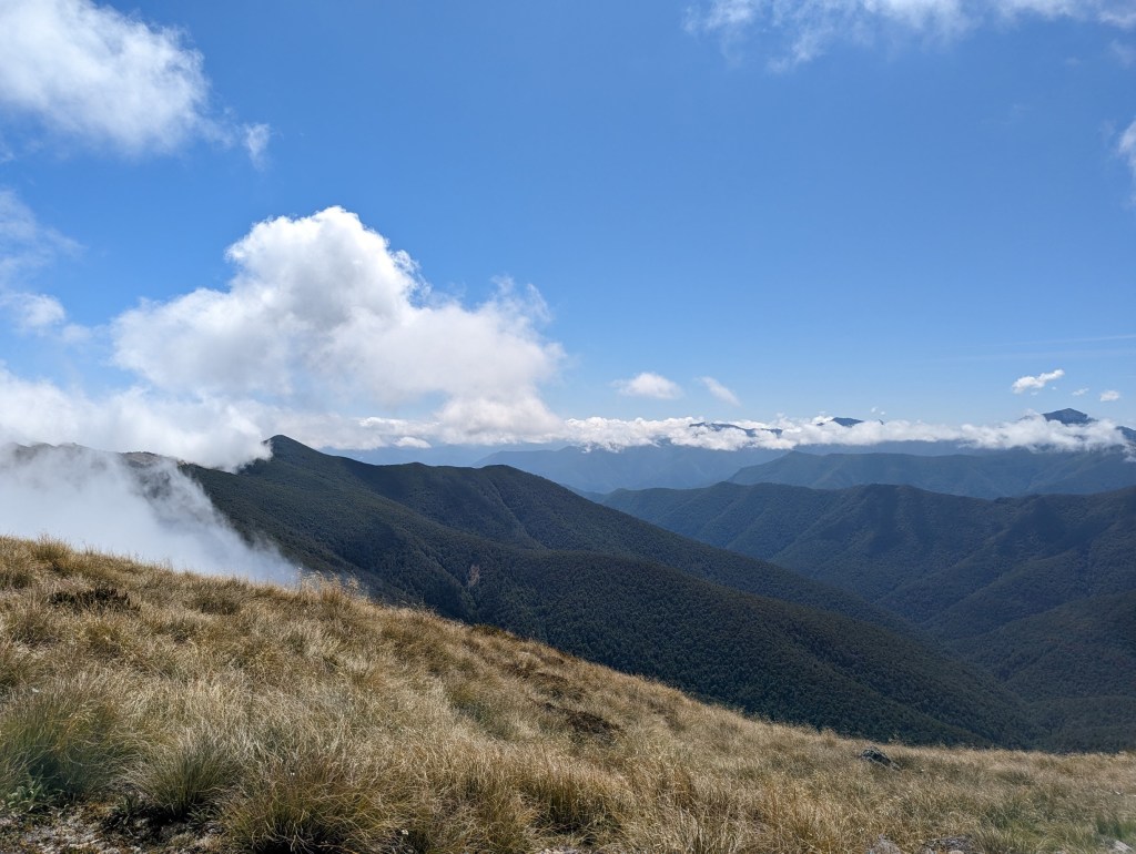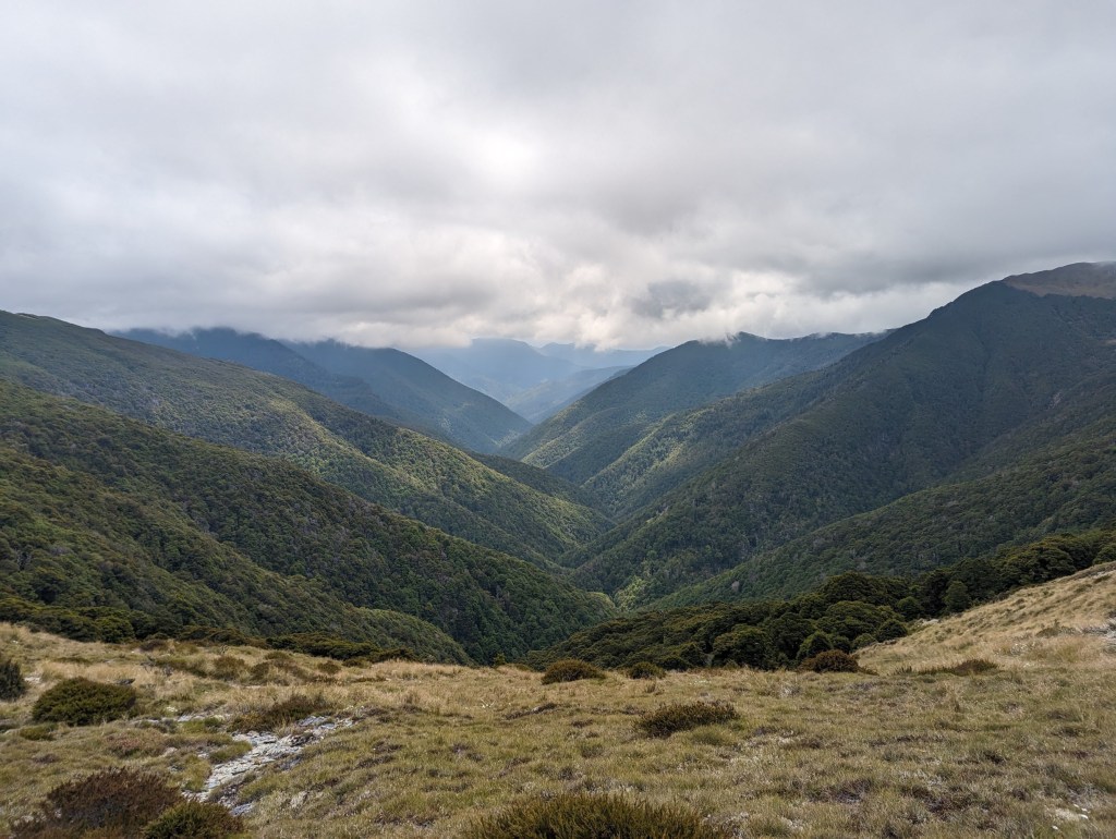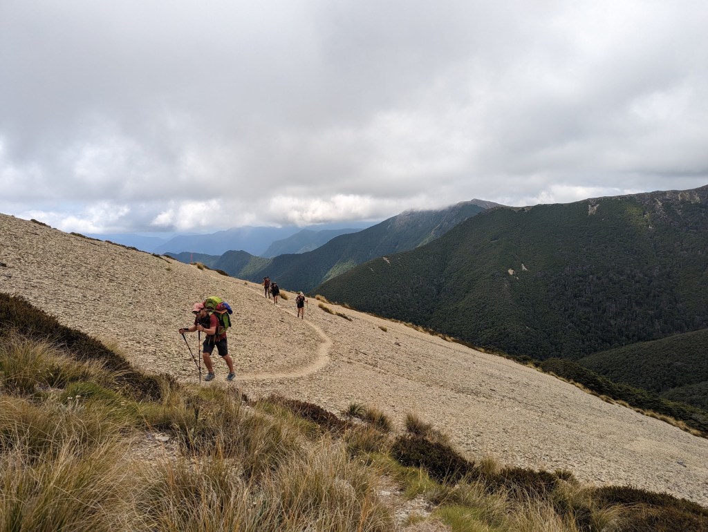 We leave Slaty Hut at around 1:40 pm after our lunch with the others. We still have about 8.3km left but with 2 more peaks to climb in between. During this time, the sky begins to be overcast, the wind picks up a little and some low clouds appear on our way. These elements, in addition to the elevation previously covered, make the ascent of the last summit – Old Man (1514m) – particularly tough.