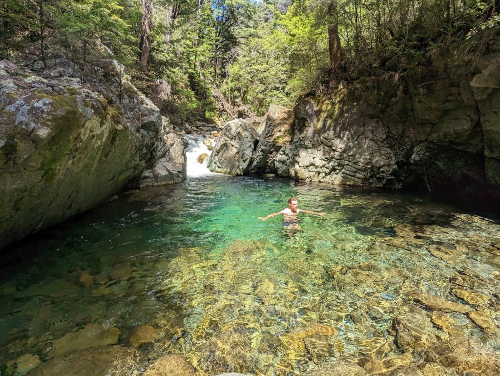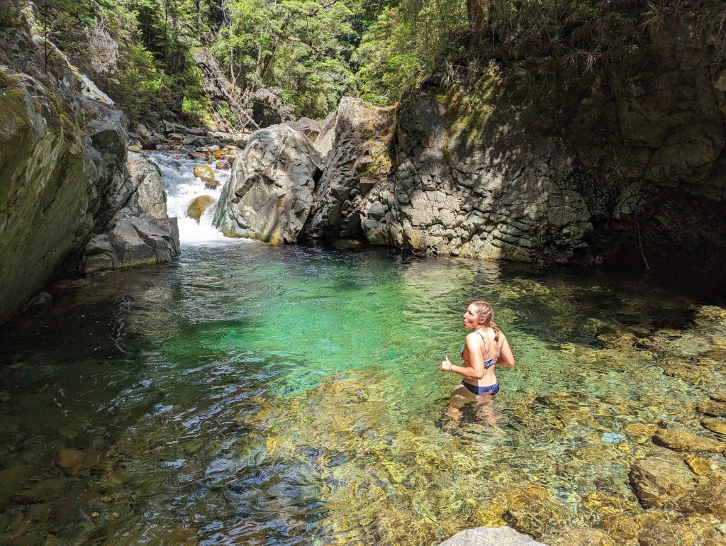 Vers 12:30 on est complètement en nage à force de marcher dans la forêt sans vent. On décide alors de nous trouver un bassin dans la rivière que nous suivons pour y faire trempette lors de notre pause lunch. Après une demi heure, Roxann et Josh nous rattrapent et nous terminons notre repas ensemble. En partant, on envoie un message via notre balise gps à Laura et Fleur pour savoir où elle sont et surtout si tout va bien. Quelques minutes plus tard on apprend qu’elle ne sont qu’à à peine plus d’un kilomètre derrière. Ouf 😊